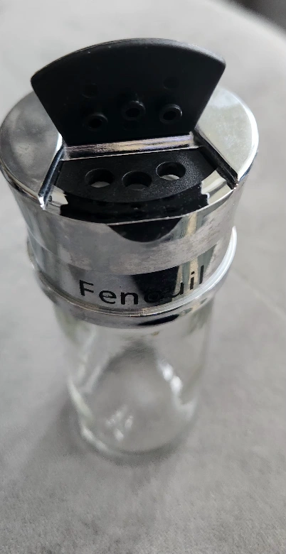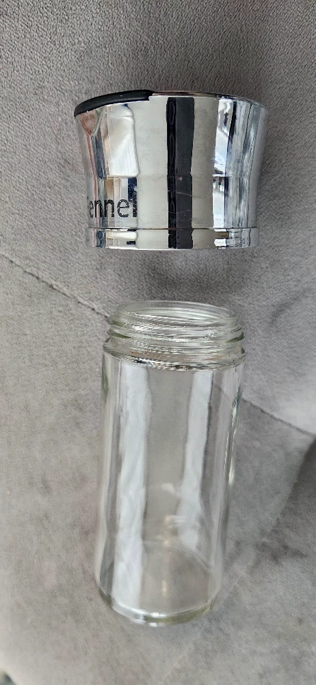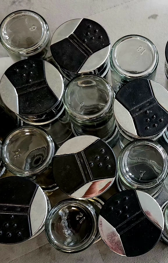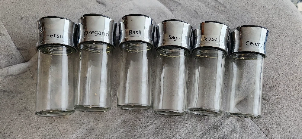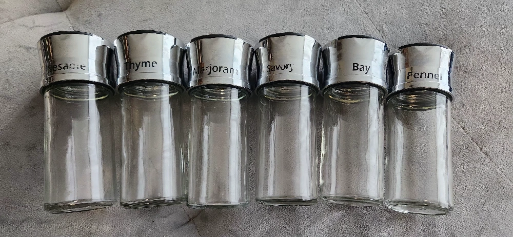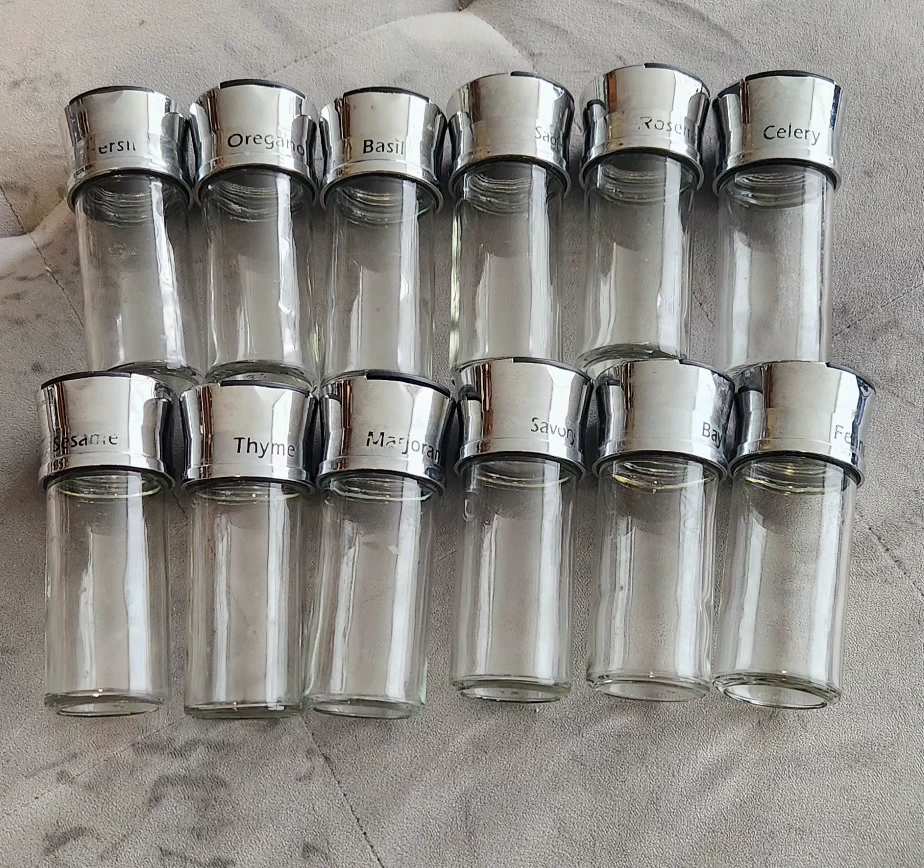 Set of twelve empty glass spice jars. Chrome-plated metal lids. Various herb labels included in black writing on the lids. Lids feature two sided opening to sprinkle or use meaduring spoons. Perfect for organizing your spices.