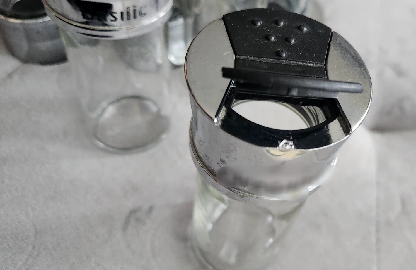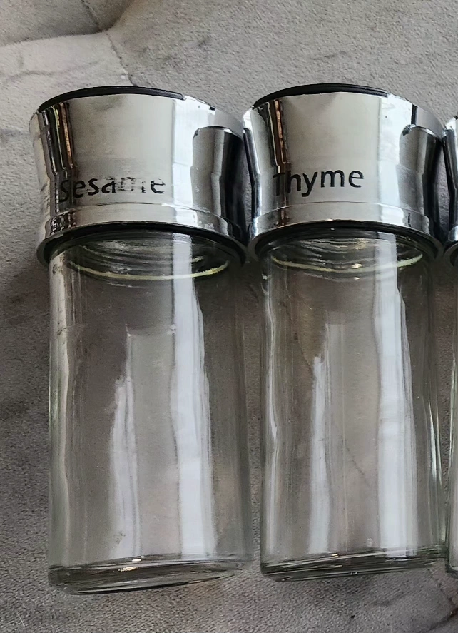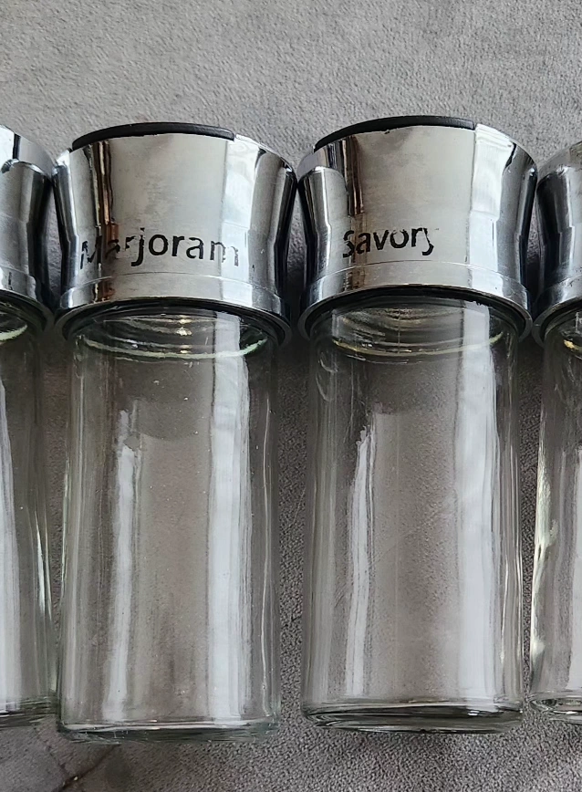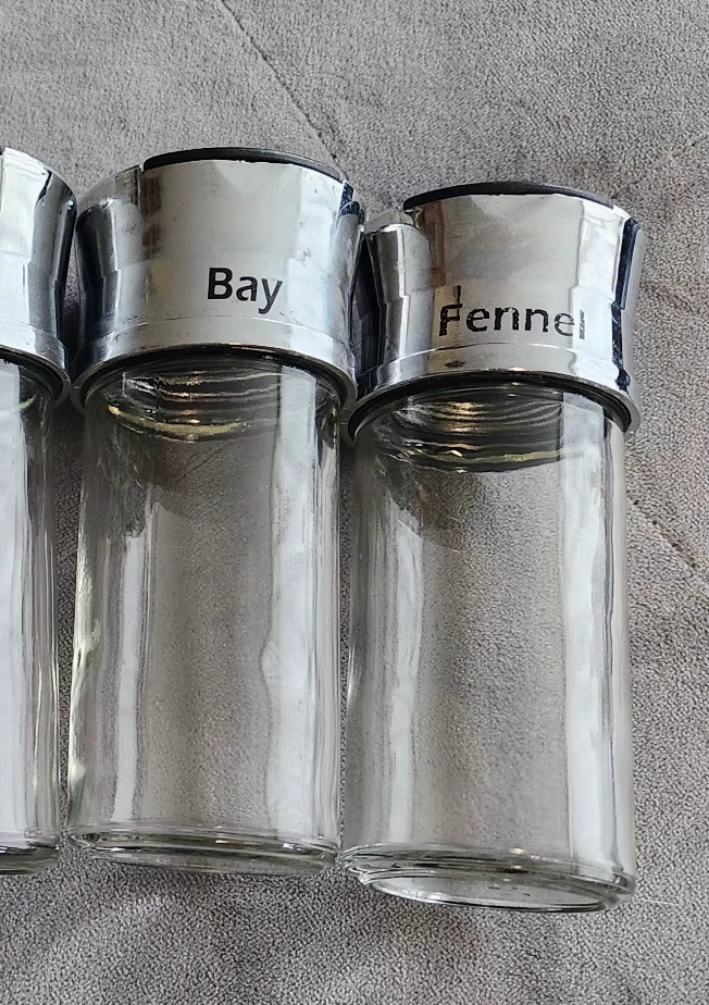 Set of 6 glass herb jars. Chrome-coloured lids with various herbs labelled in black writing. Lids feature two openings; one for sprinkling and one for pouring. Great for organizing your herbs. Measures 4.6" tall, 2" wide lids and 1.6" glass bottom. Good used condition. Can be sold individually as well.