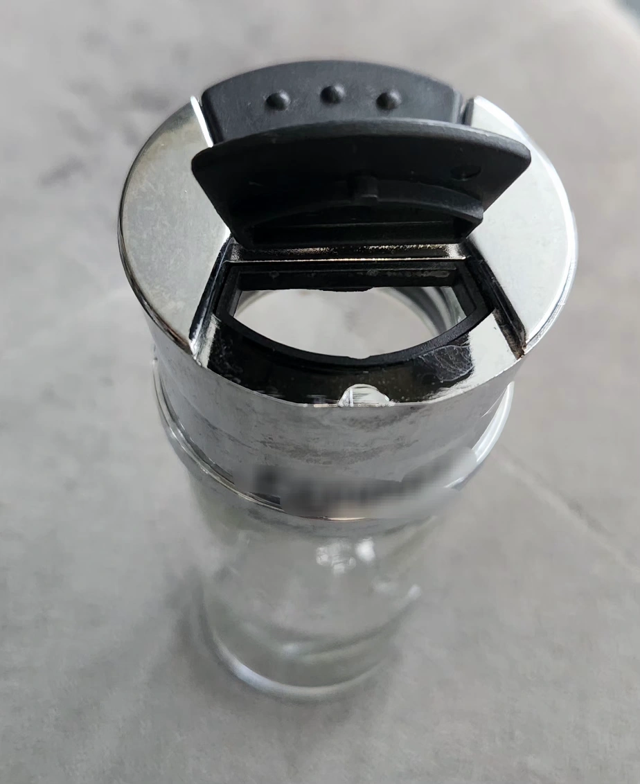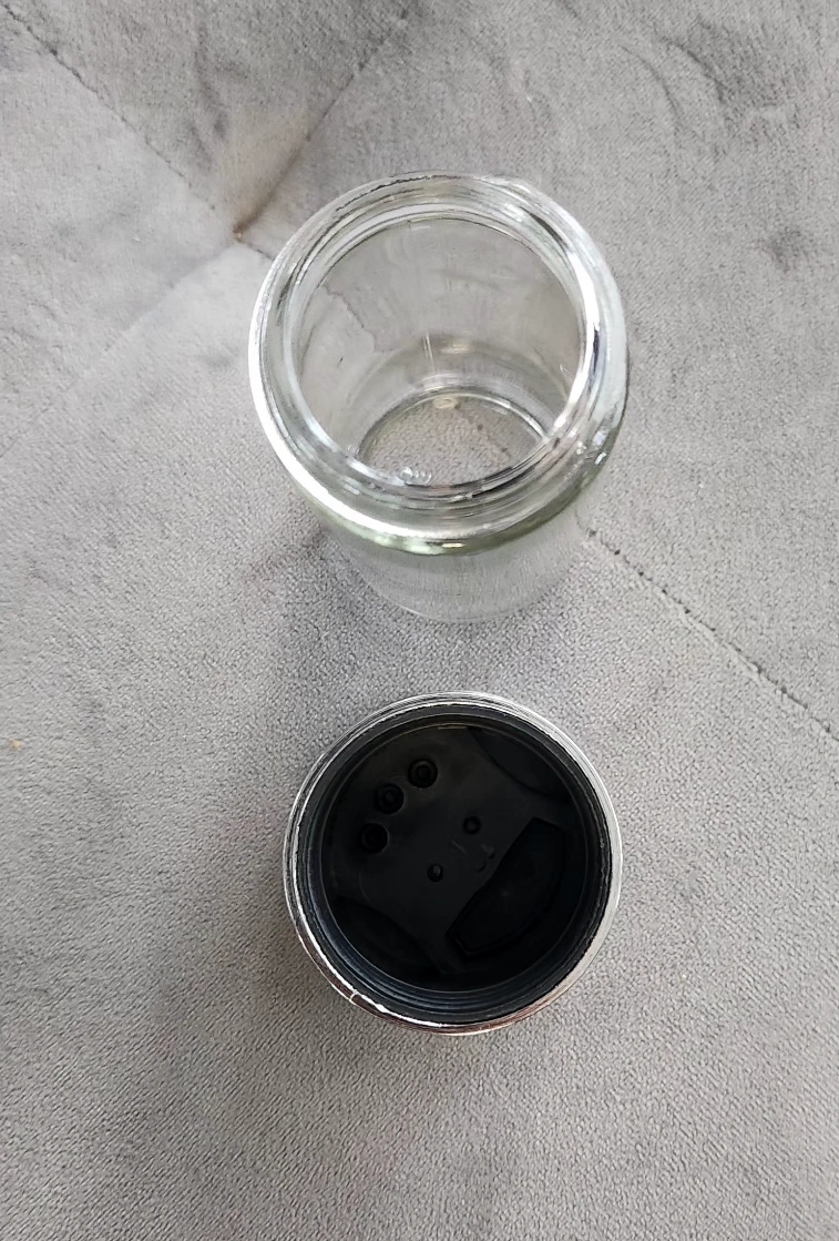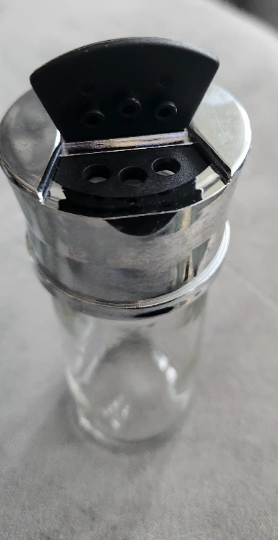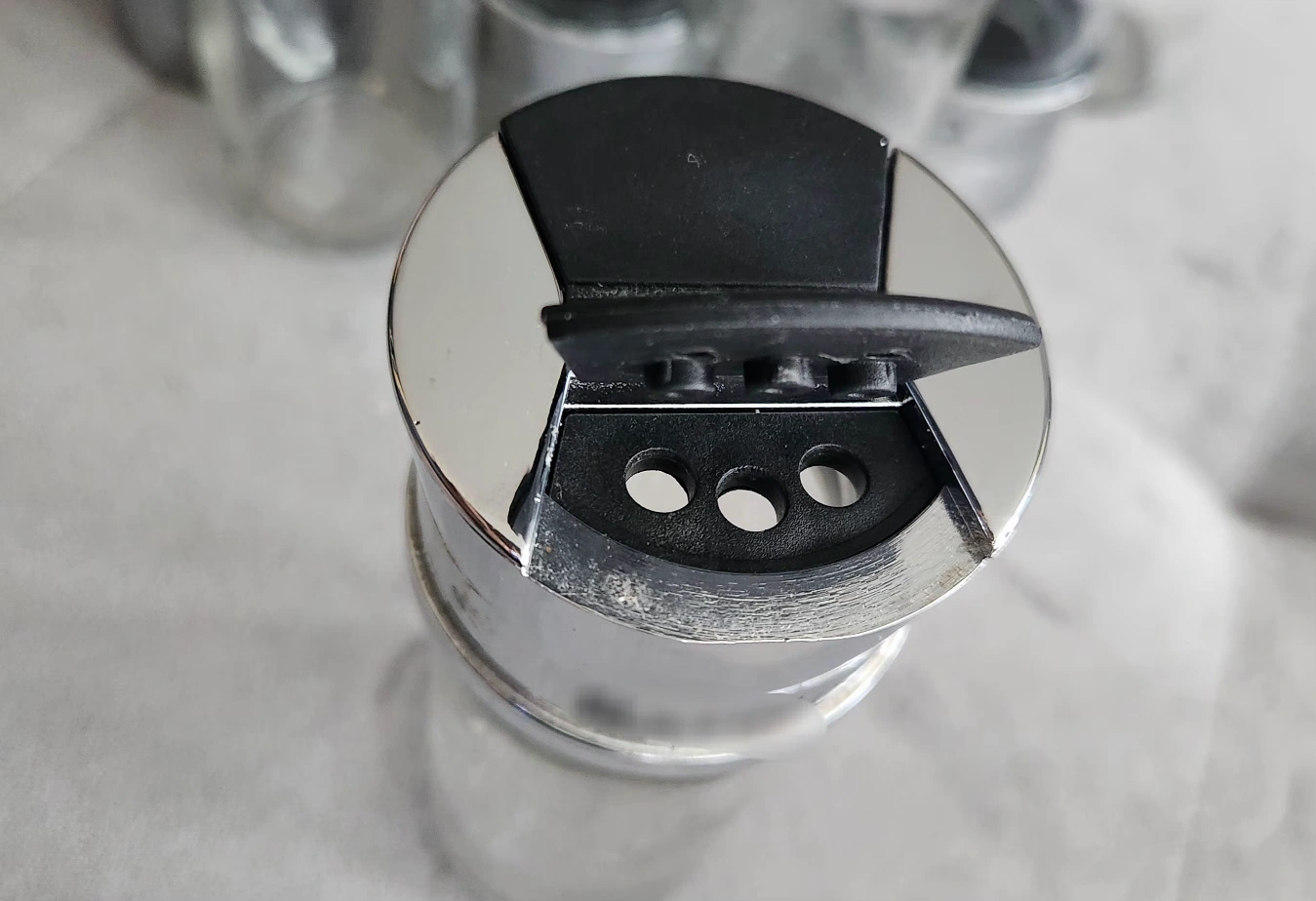 Set of 6 glass herb jars. Chrome-coloured lids with various herbs labelled in black writing. Lids feature two openings; one for sprinkling and one for pouring. Great for organizing your herbs. Measures 4.6" tall, 2" wide lids and 1.6" glass bottom. Good used condition. Can be sold individually as well.