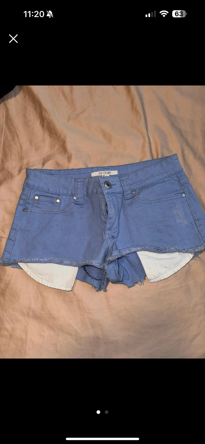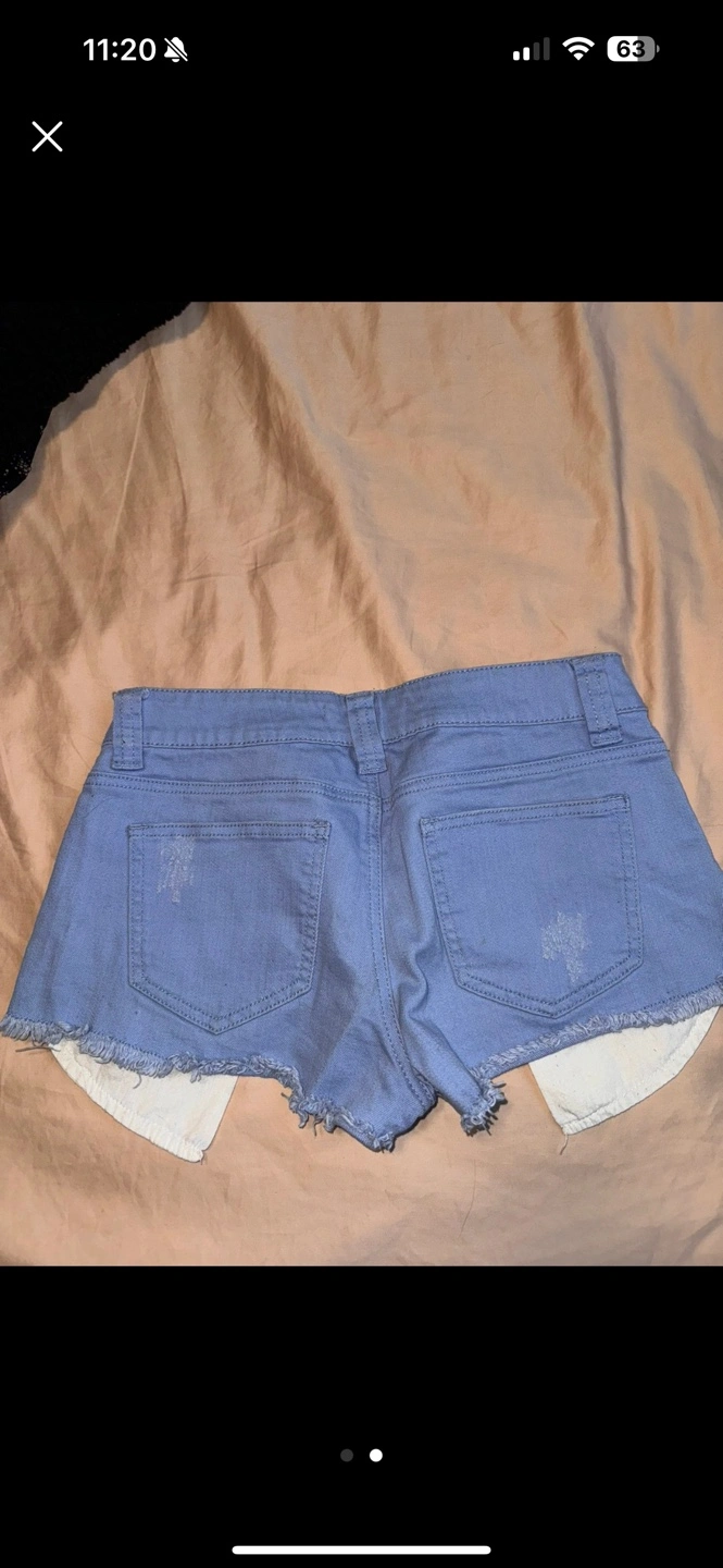 Cute light blue denim shorts. Distressed detailing. Frayed hems. Great for summer.