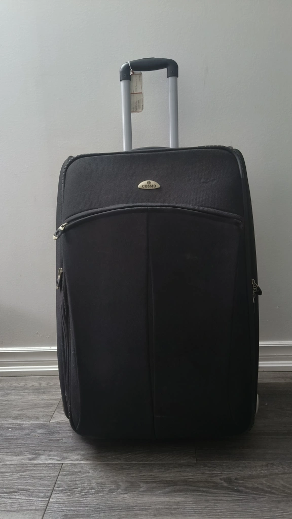 Black rolling suitcase. Features a telescopic handle and wheels. Good for travel.