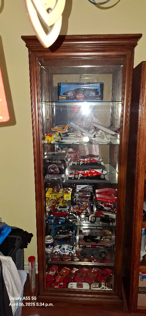 Dark brown wooden display cabinet with glass shelves. Houses various collectible model cars, planes, and other items. Great for collectors or enthusiasts.