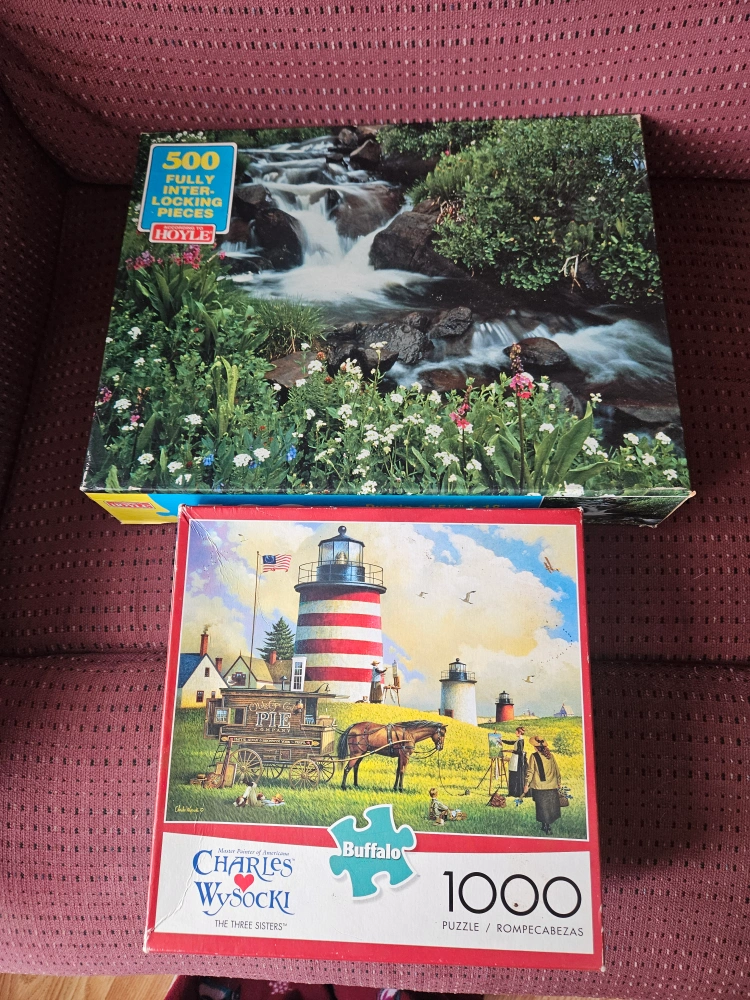 Two boxed jigsaw puzzles. One depicts a waterfall scene, 500 pieces. The other shows a lighthouse, 1000 pieces.