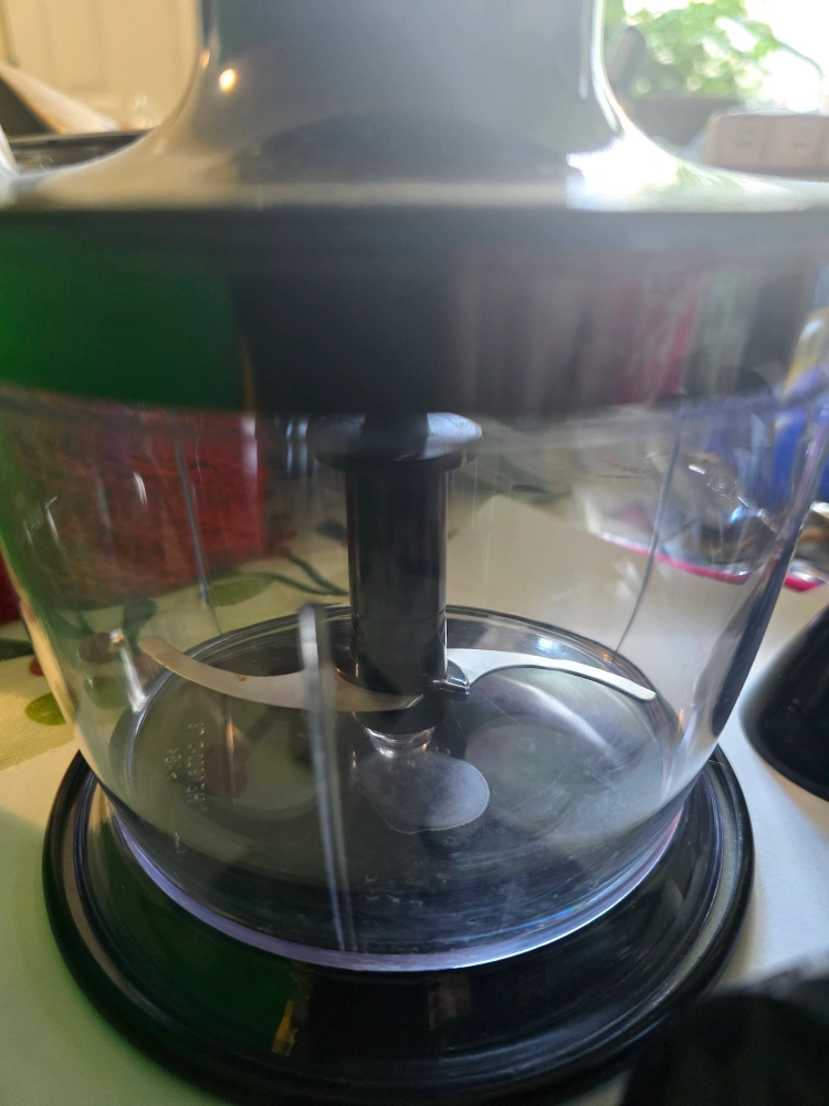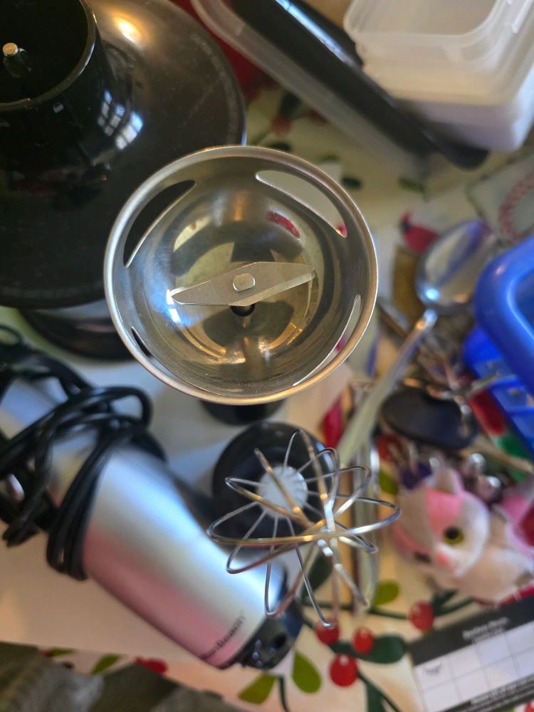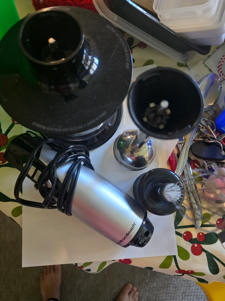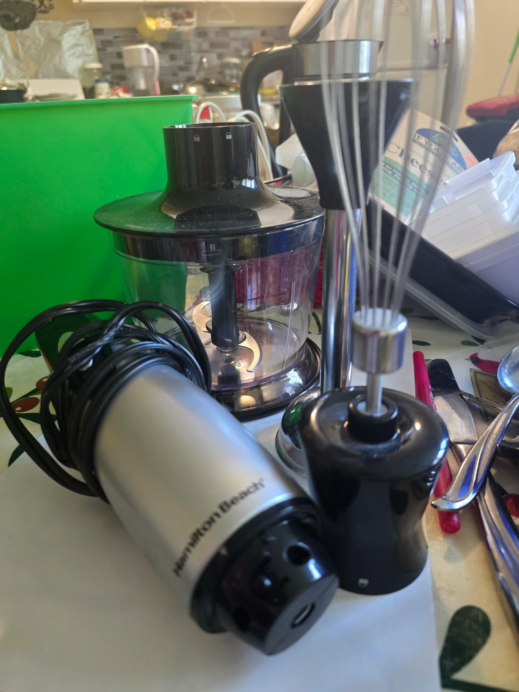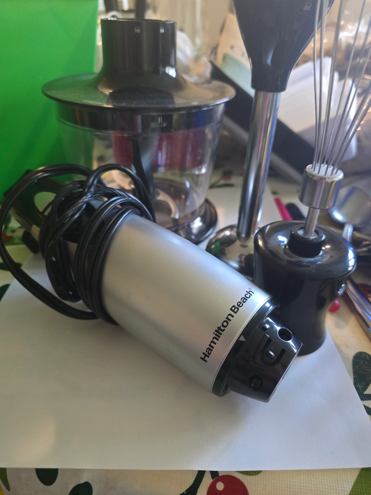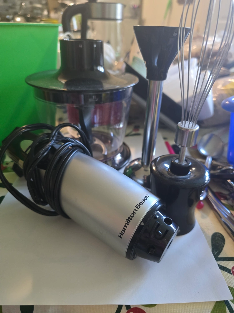Used Hamilton Beach immersion blender. Includes multiple attachments: chopping bowl, whisk, and additional blades. Good condition.