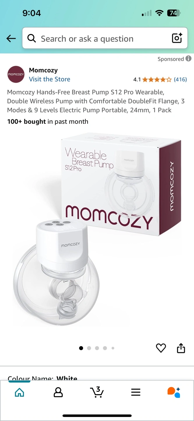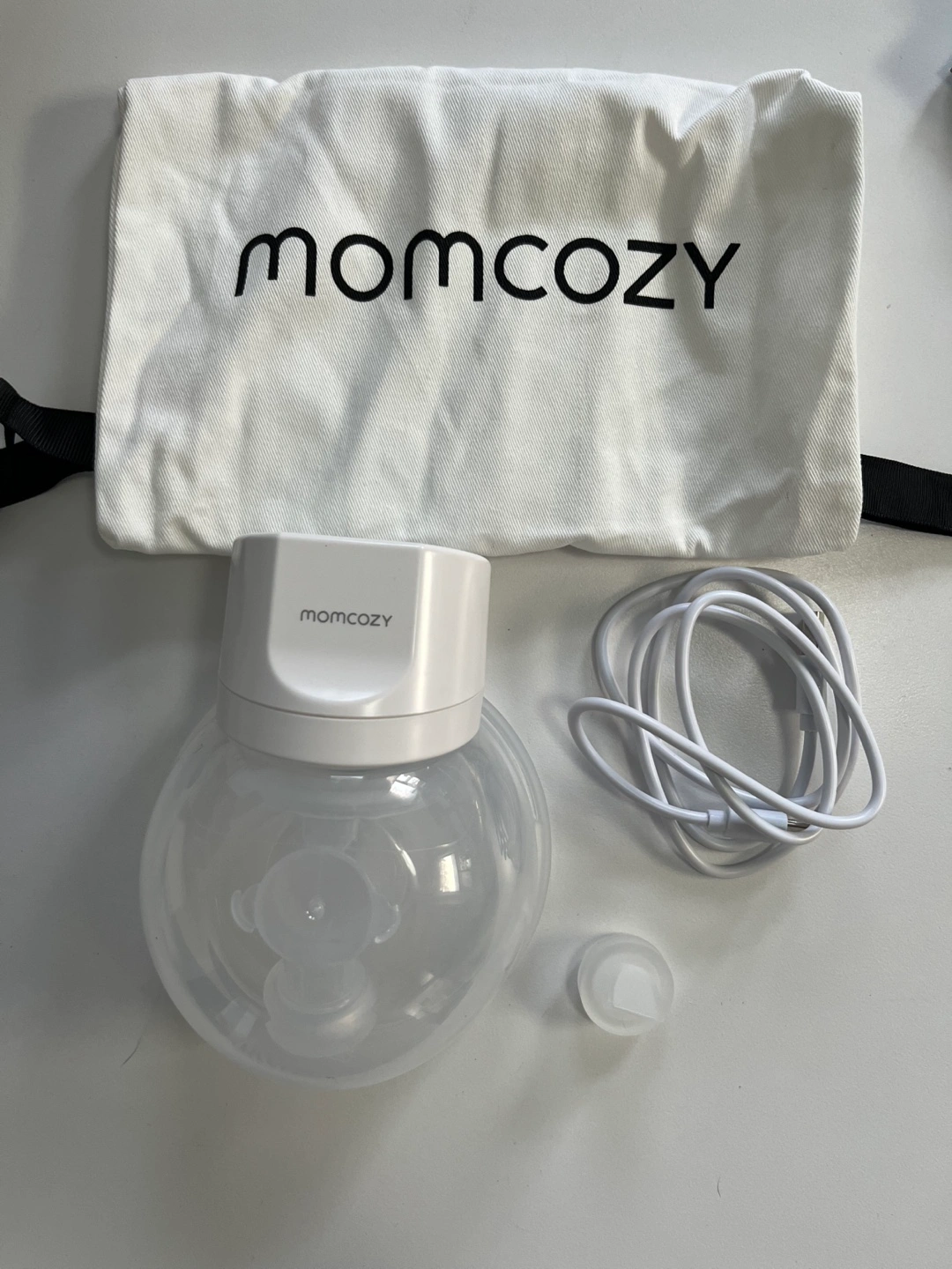 Momcozy hands-free breast pump. Wireless, portable, 3 modes & 9 levels. Includes carrying bag and charging cable, 2 flange, 24mm.