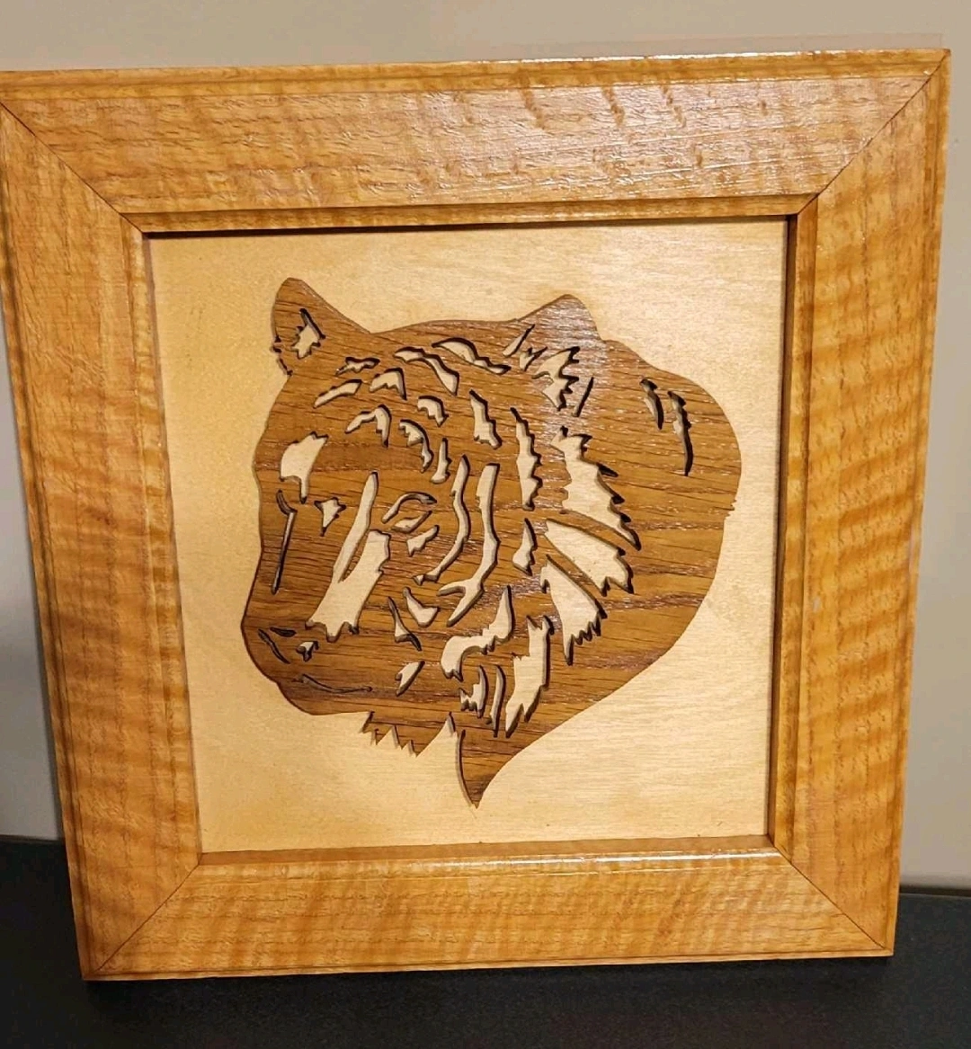 💚Beautiful wooden tiger head cutout. Framed piece. Handcrafted. Unique home decor. Small size.💚