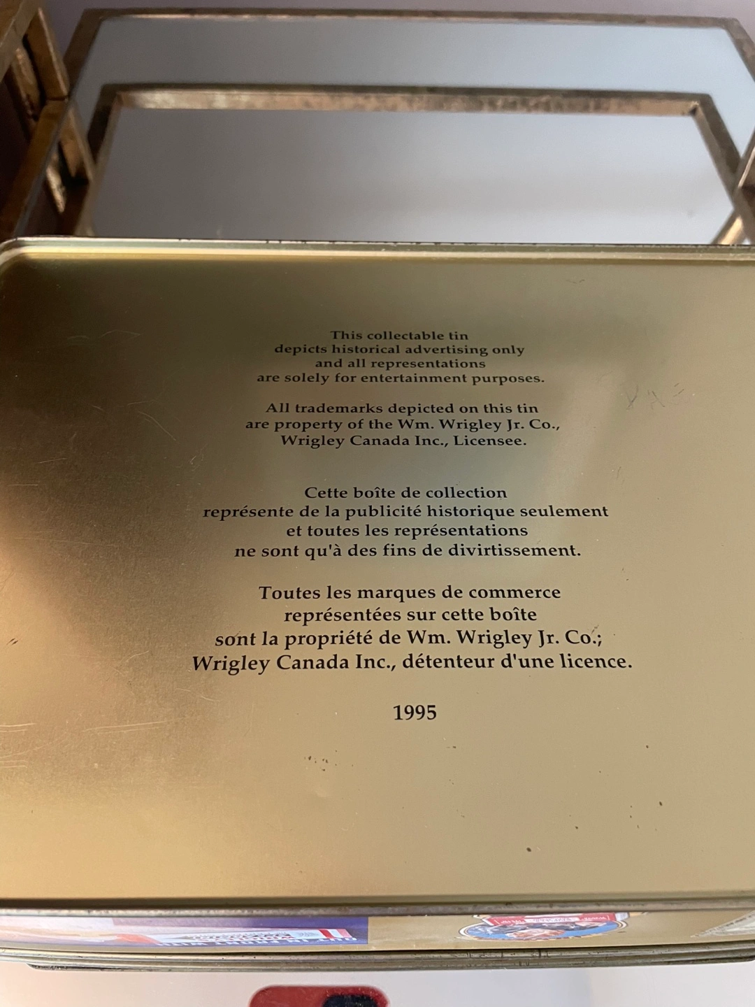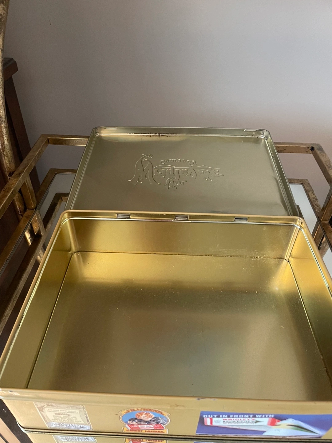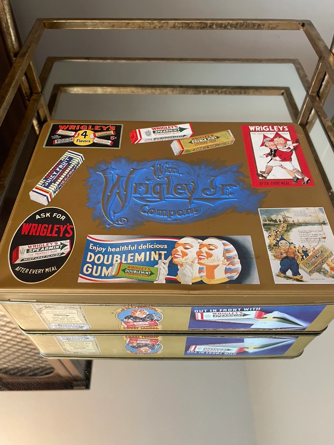 1995 collectible tin featuring vintage Wrigley's advertisements. Gold-toned metal. Various labels and images on all sides. Great for collectors or display. Located in Osborne Village with easy accessible driveway for pickup . This collectable tin was manufactured by Wm. Wrigley in 1995 . It was to store their collection of sports cards. Measures 10.5” x 8” x 3” and is in excellent condition. There are a few small scratches on the top lid . Hinges are perfect and metal and images are in excellent condition as well. Etransfer for guaranteed hold Cash transactions are FCFS and square reader for debit and credit cards at pickup as well . Please see my other listings as I downsize