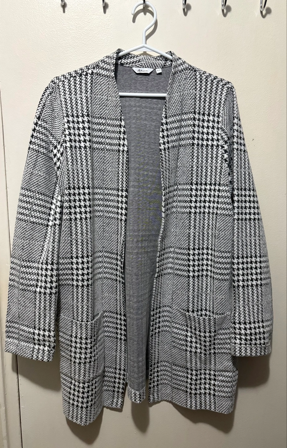 Lightweight open-front Coatigan. Black and white houndstooth pattern. Long-sleeves. Two pockets. Size XL. In excellent condition. I only wore it once. 😊