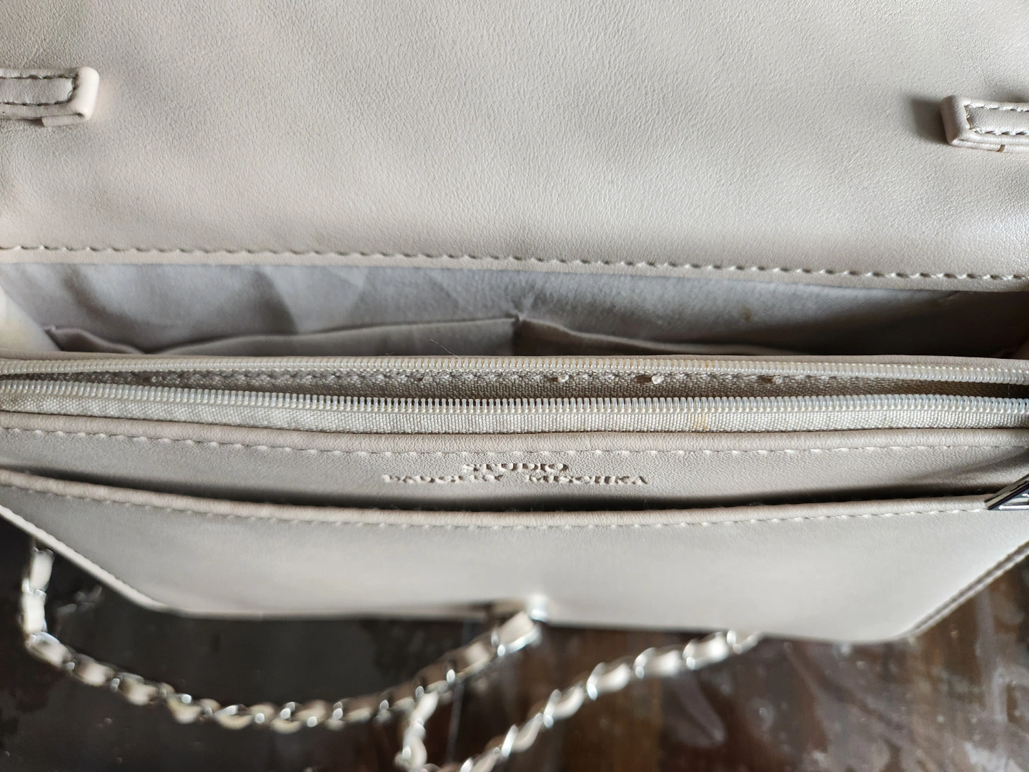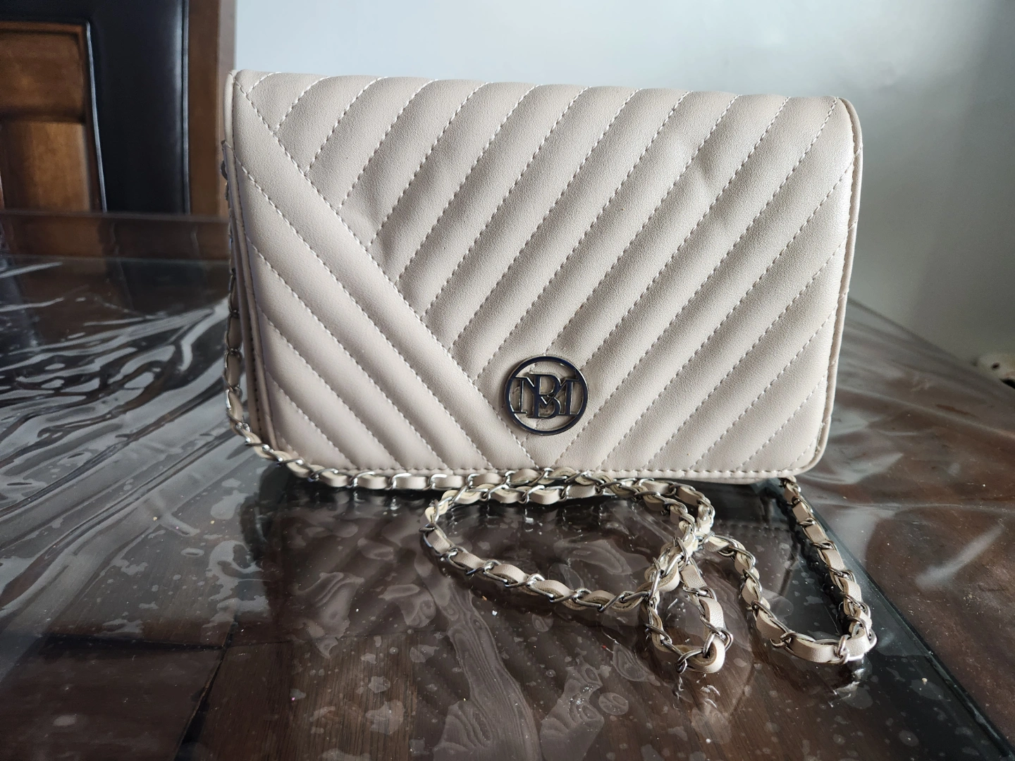 Beige quilted crossbody bag. Features a silver chain strap and logo detail. Interior zipper pocket and multiple compartments. Excellent for everyday use.