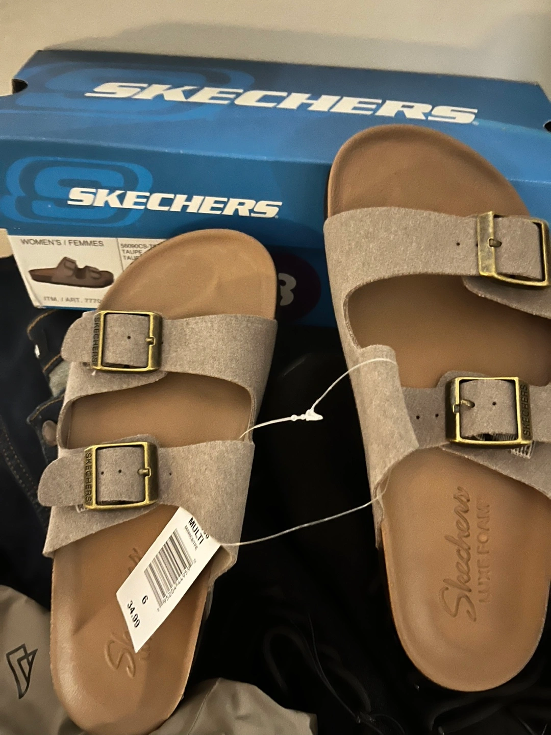 Grey double buckle sandals. Brown sole. New with tags. Women's size 6. Retail: $34.99 + tax Now: $20 …sale $15 Pick up Only. **box has 8 sticker, but shoe is size 6. They mixed up the box . NWT.