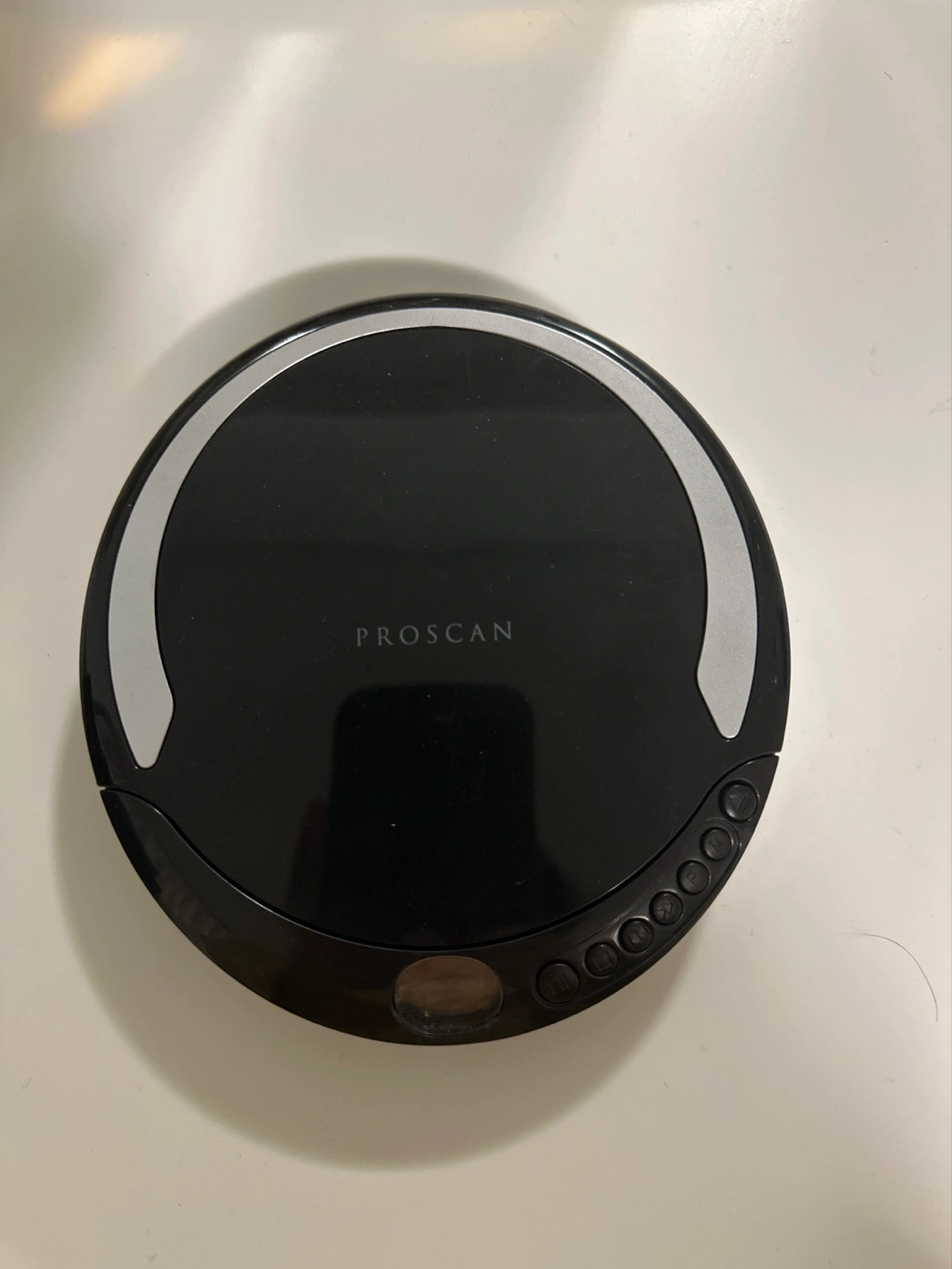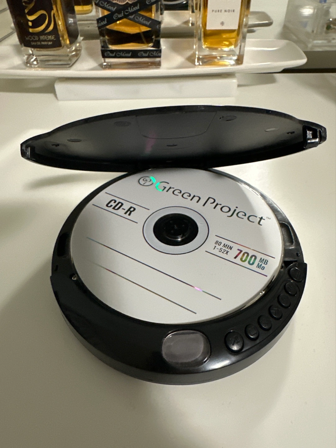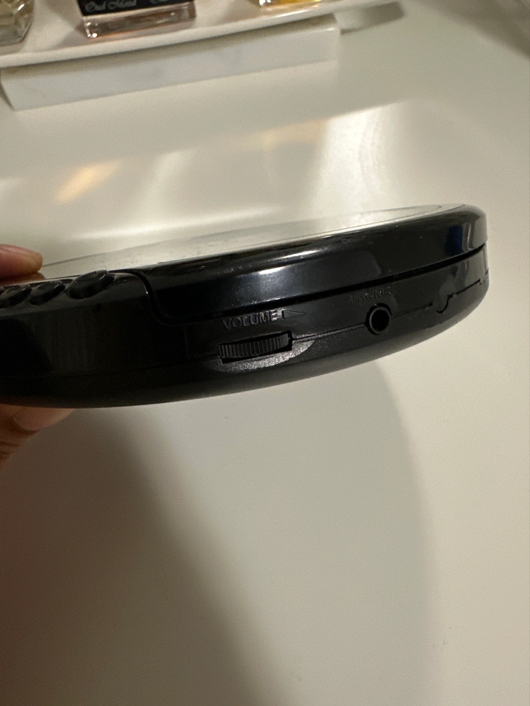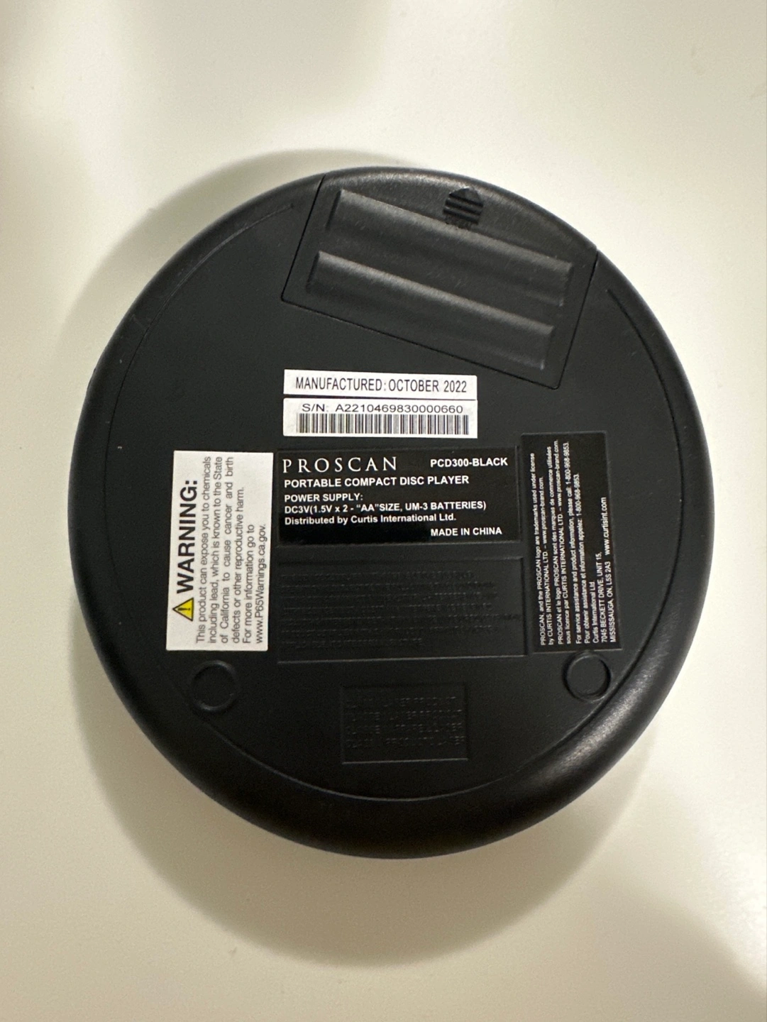 Portable CD player. Plays CDs. Black colour. Includes headphone jack. Volume control. Manufactured October 2022.