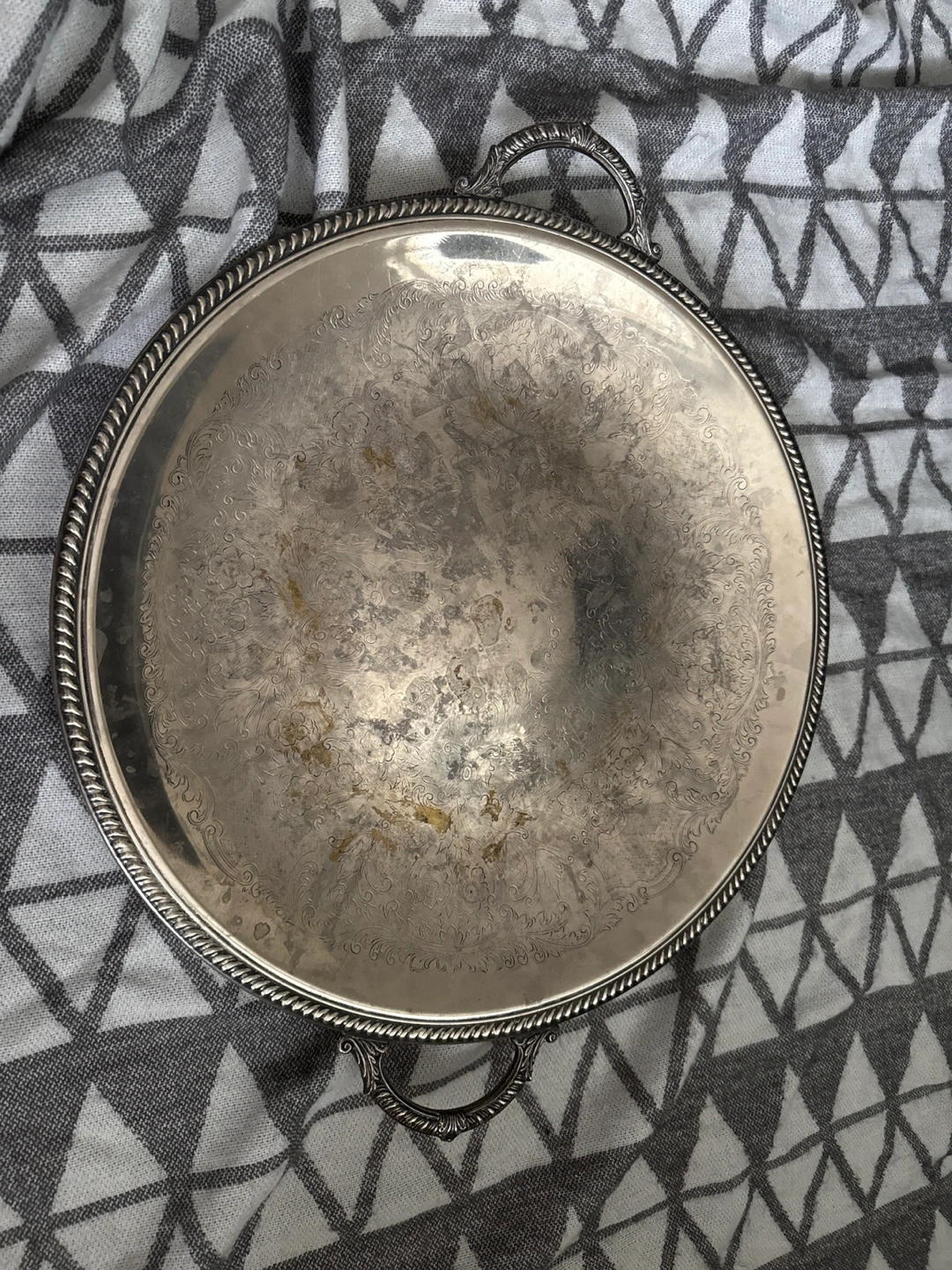 Large round serving tray. Intricate detailing. Two ornate handles. Silver-plated. Shows signs of age and use. Perfect for vintage or antique lovers.