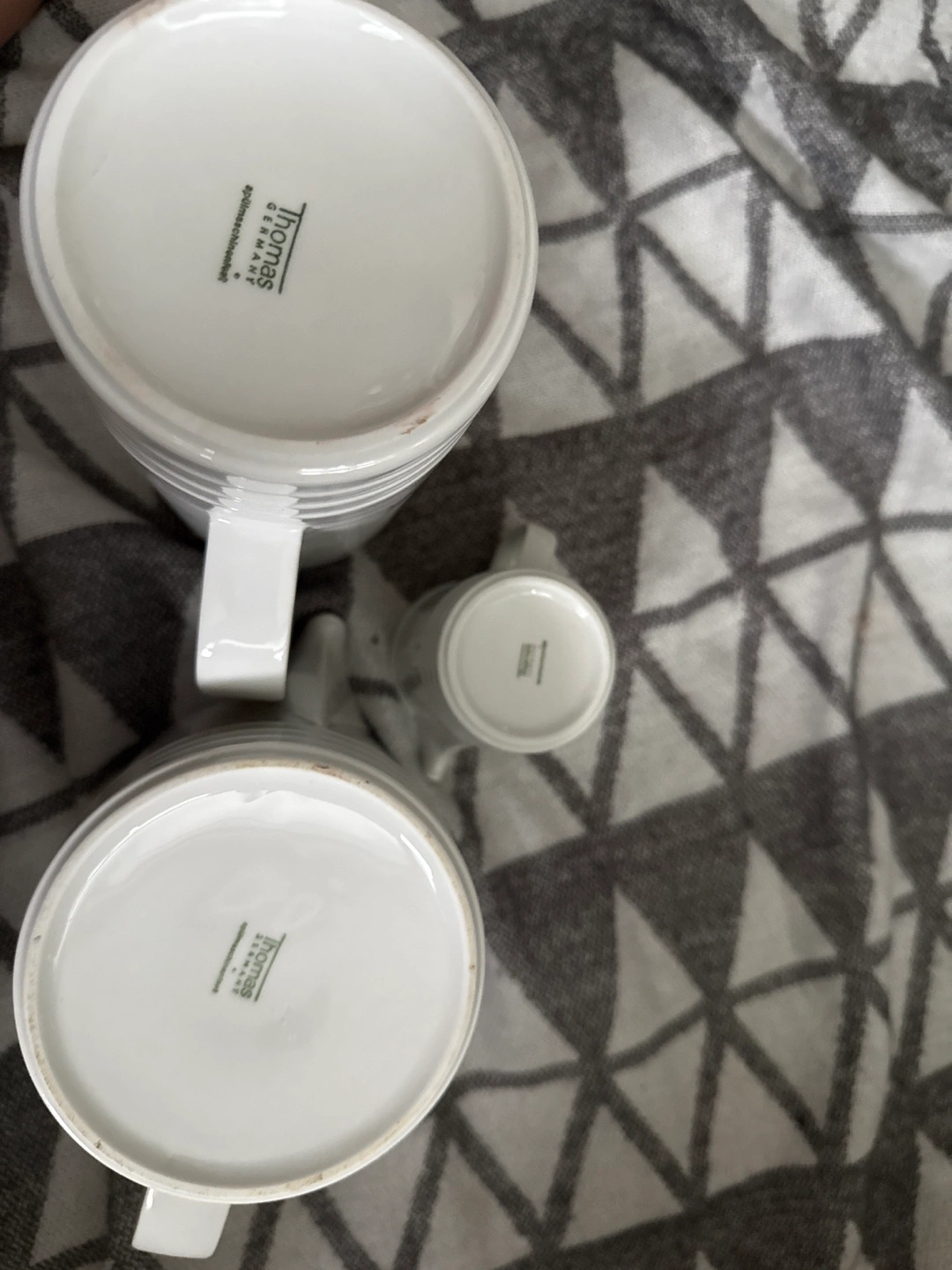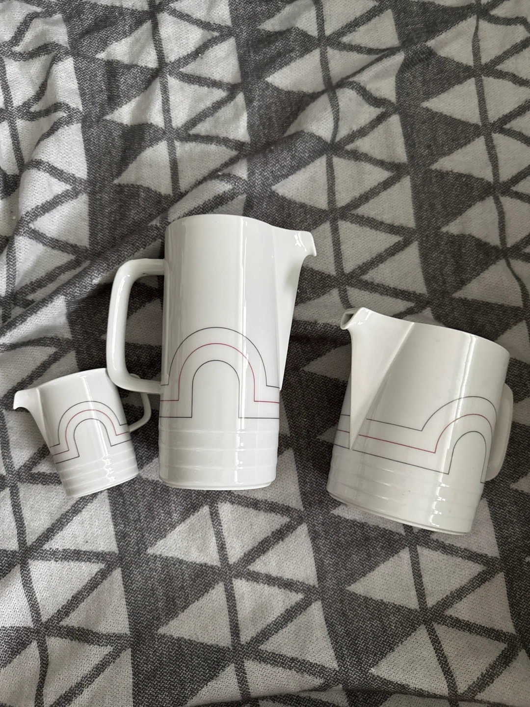 Three-piece porcelain creamer and pitcher set. White with minimalist geometric design. Made in Germany.