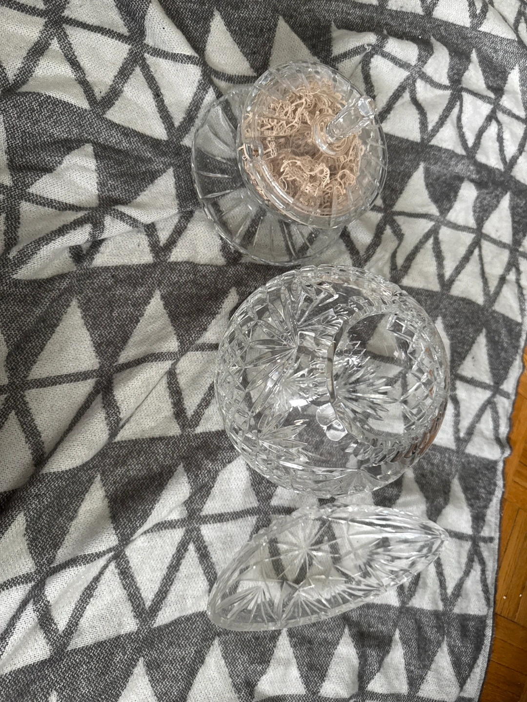 Elegant crystal candy dish set. Includes a covered dish, a separate bowl, and a decorative tray. Intricate cut crystal design. Perfect for serving candies or displaying decorative items. Some lace coasters included.
