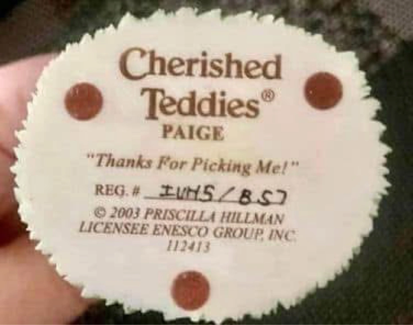 Adorable Cherished Teddies figurine. Paige bear in light blue outfit. Collectible item. Excellent condition. ππ·π»π·ππ·π»π·π This Cherished Teddies figurine, named Paige, is a delightful collectible from 2003 by Priscilla Hillman. It's in good, used condition, ready to add a touch of sweetness to your display. If you've been hunting for a Cherished Teddies piece to complete your collection, Paige is ready to come home with you! After all, if the ad's still up, she's still available! Collectable figurine β Cherished, teddies β . Never used , always stored . From smoke free home . Pick up ONLY , in Woodstock . $15 firm . Cash only . Itβs first come first served.