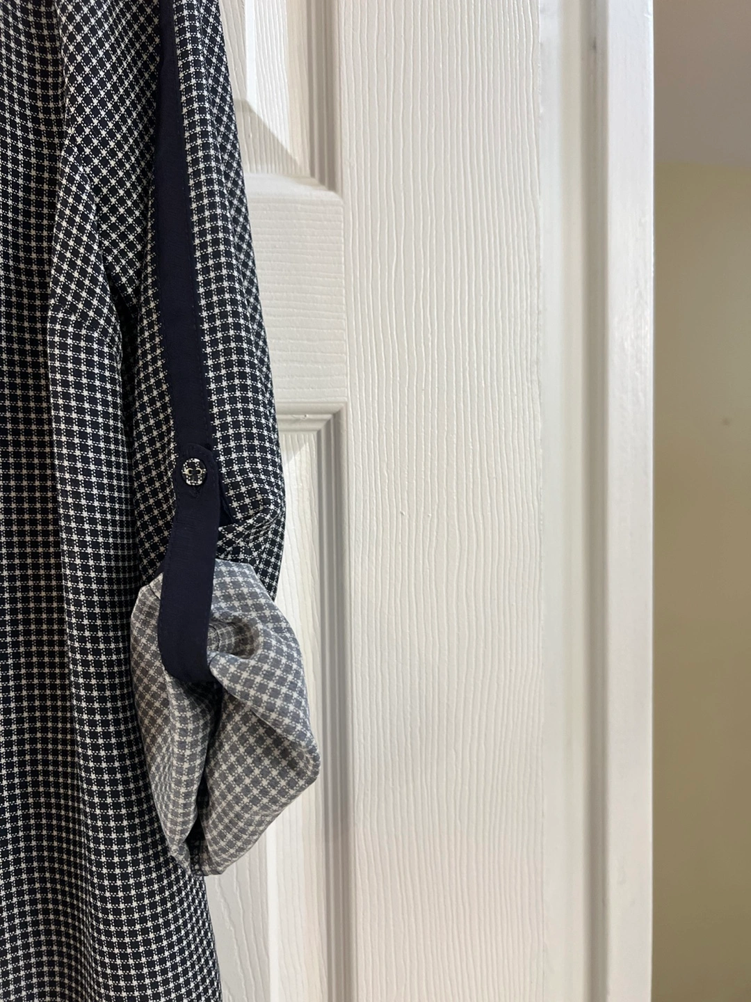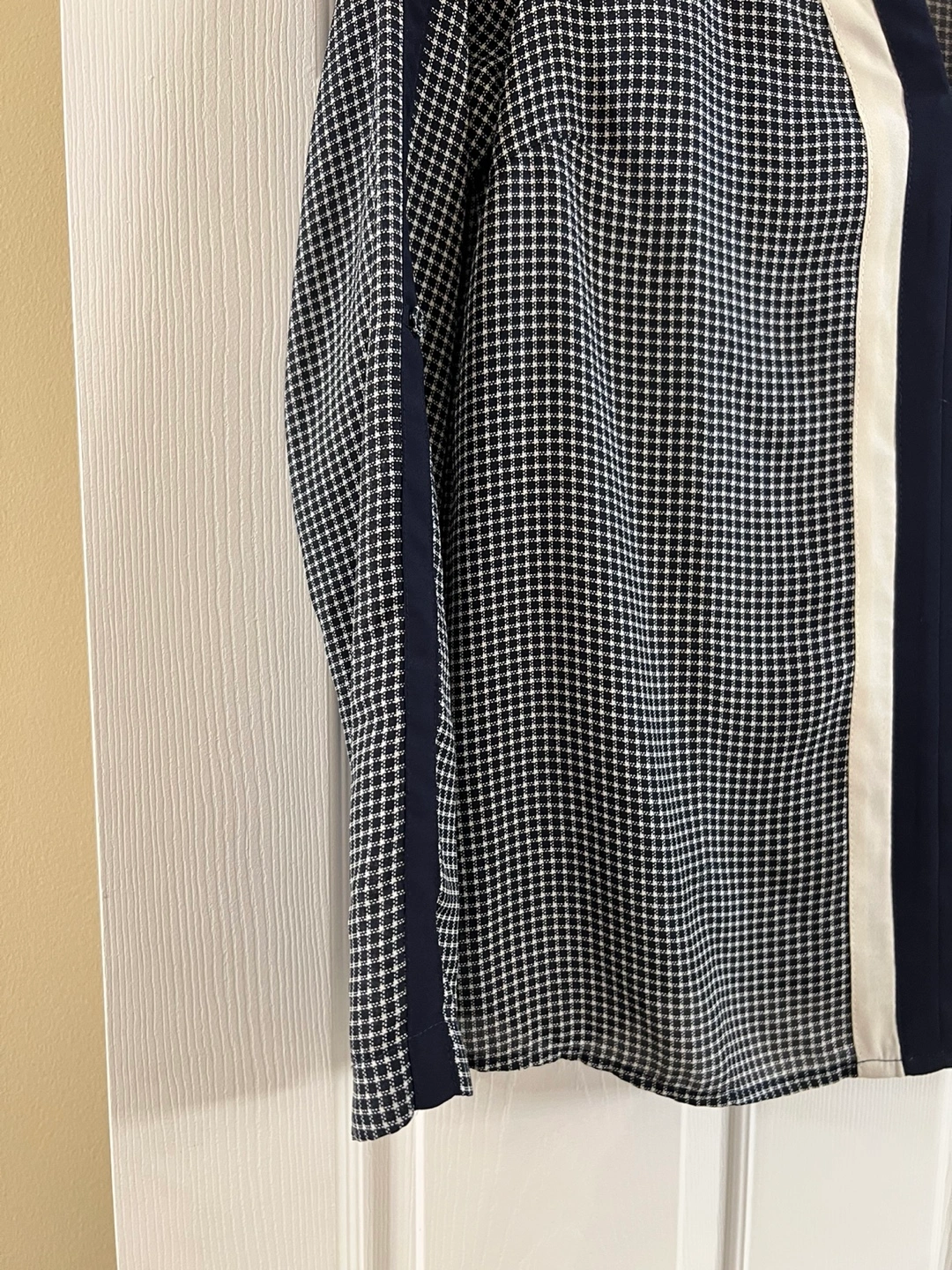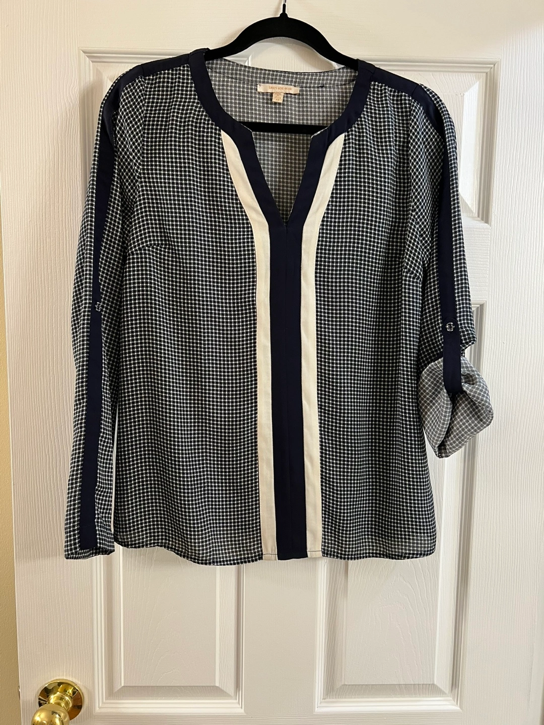 Navy and white patterned blouse. Long sleeved or roll them for three quarter sleeves. V-neck. Features contrasting navy and cream panels down the front. Pick up Yonge & St Clair Cash required Please see my other ads