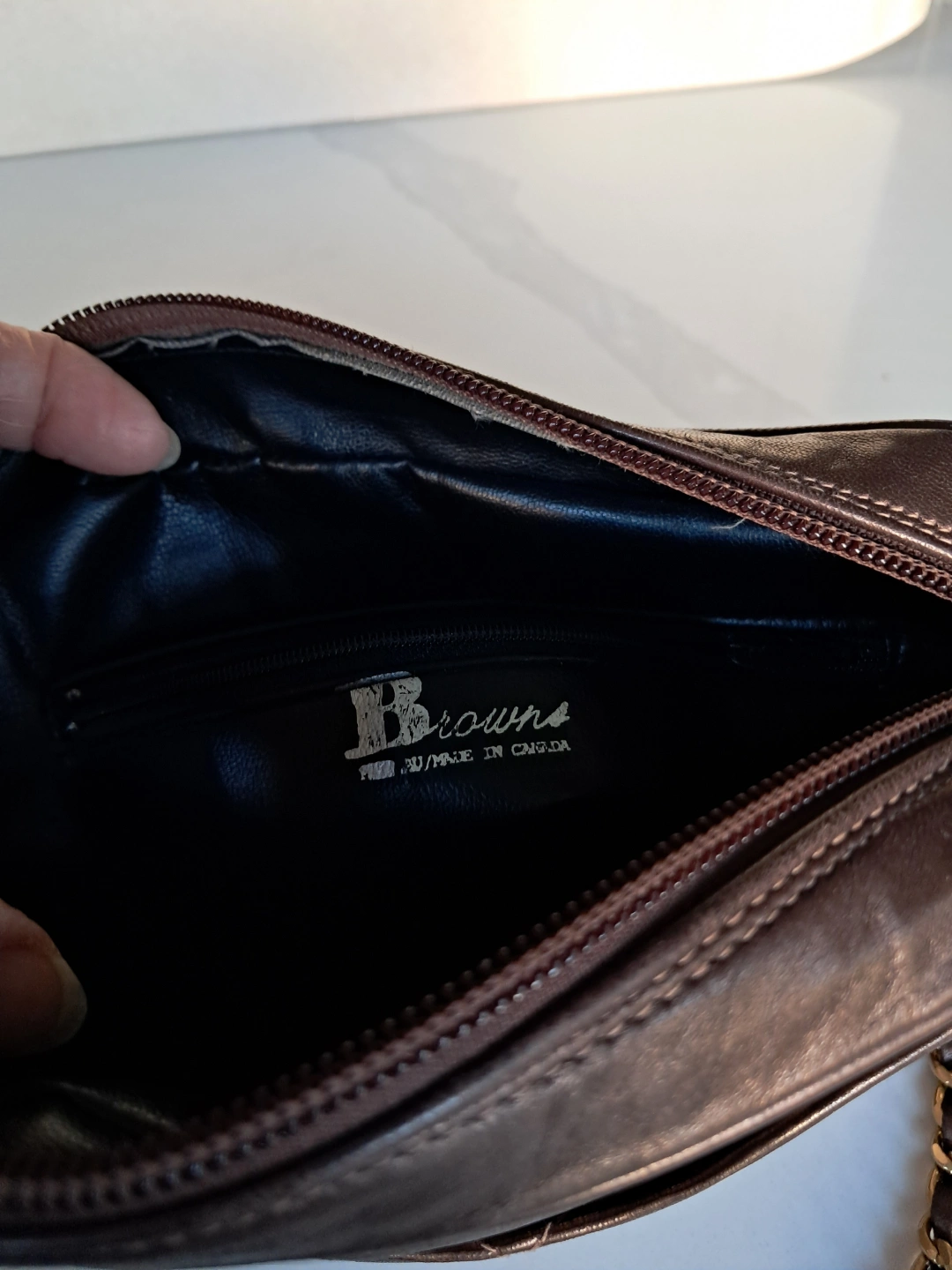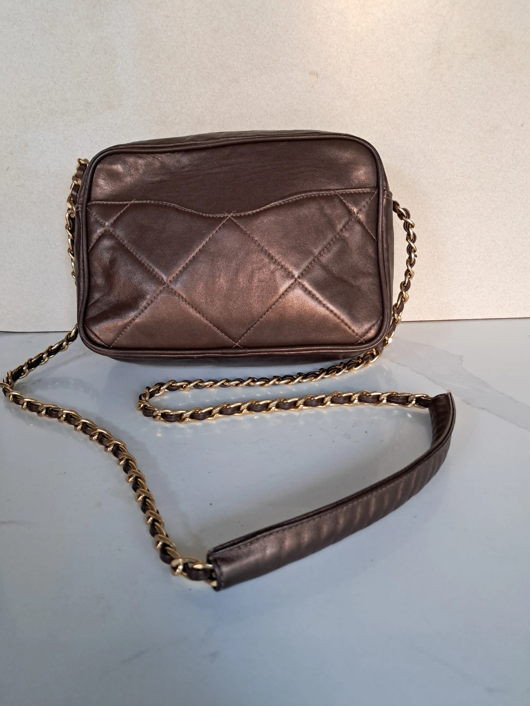 Metallic Brown/Bronze leather crossbody bag. Gold chain strap. Zipper closure. Interior pocket. Made in Canada.