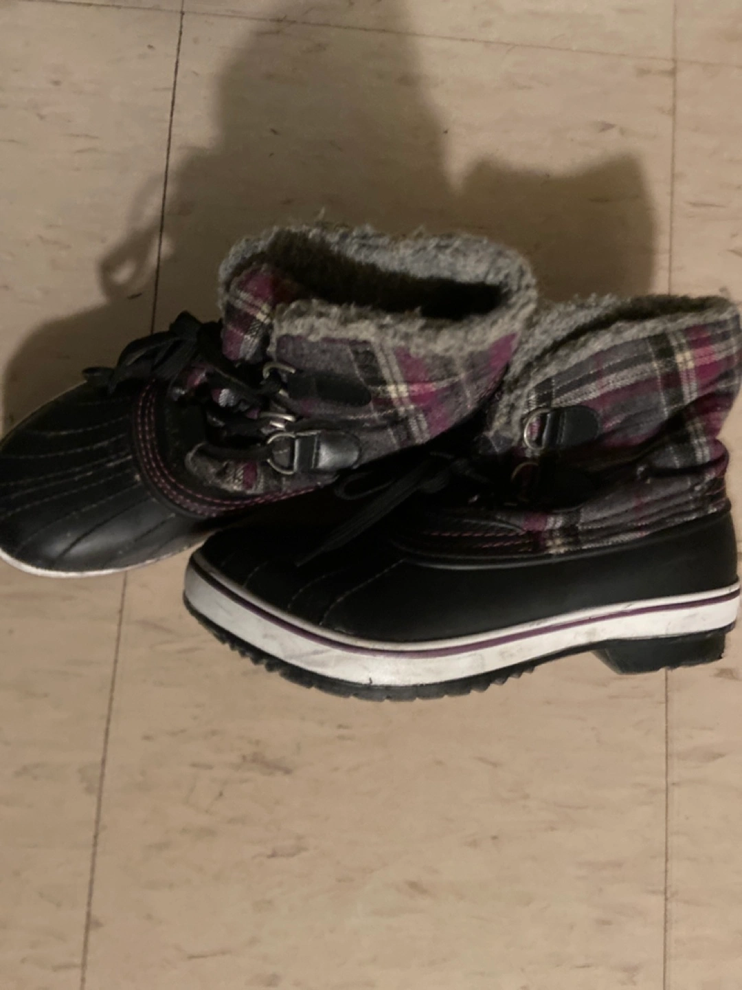 winter boots. Black waterproof exterior. Purple and grey plaid interior. Lace-up closure. Good for snow.