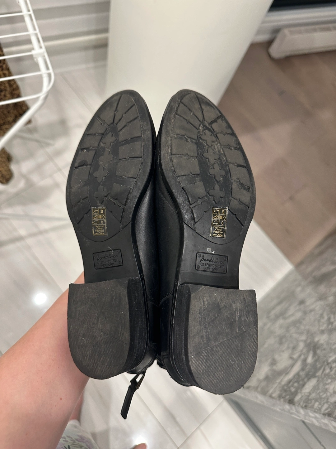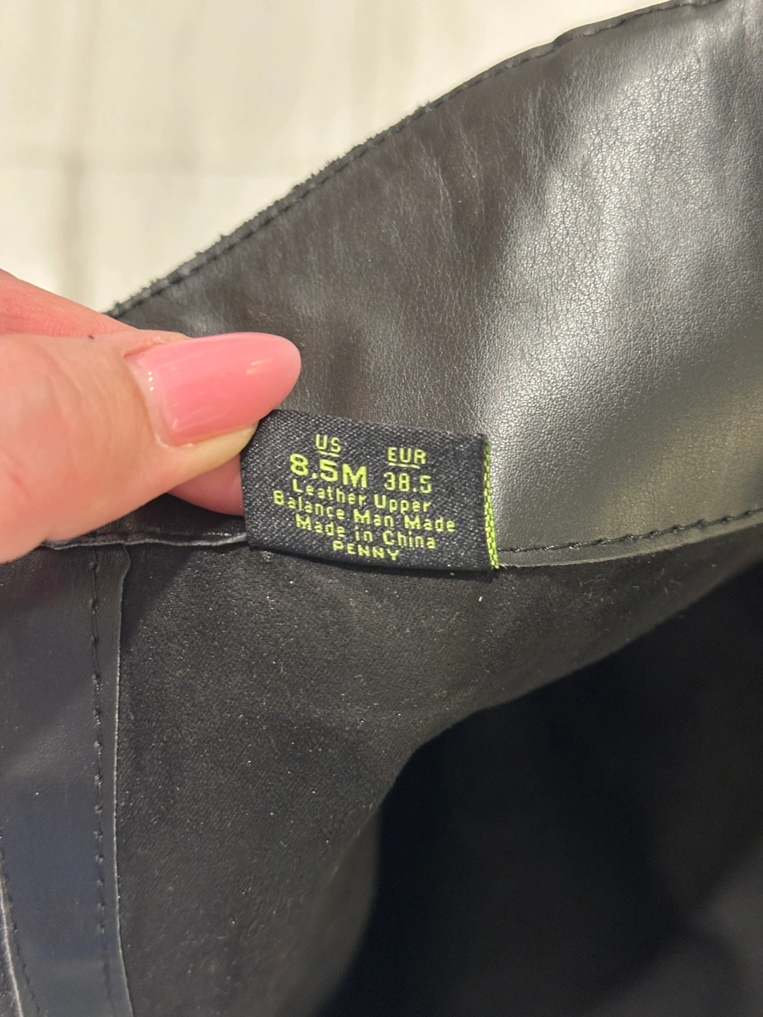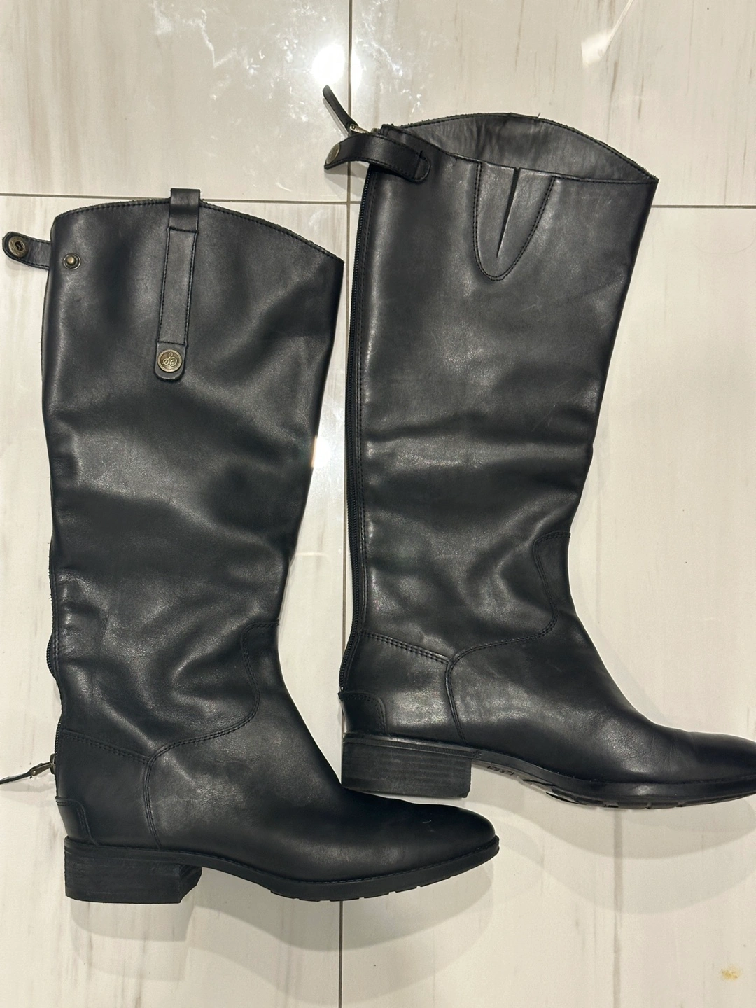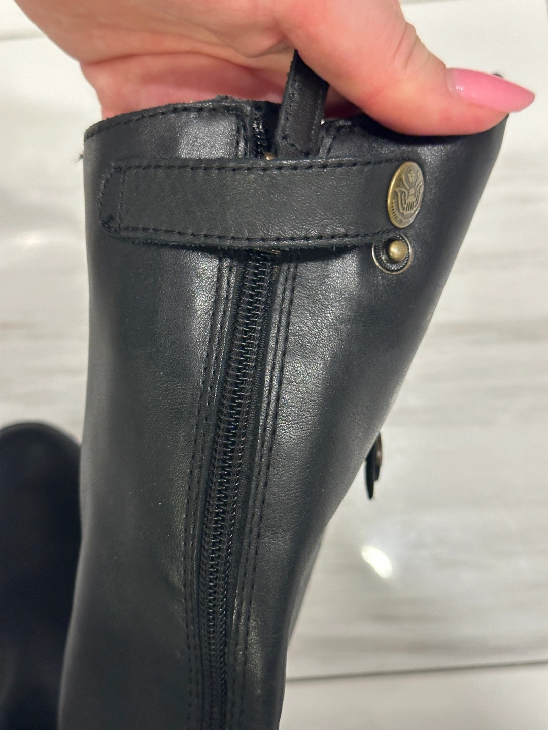 Women's black leather riding boots. Side zip closure. Like new condition. Size 8.5M. I literally wore them once to a restaurant, and travelled by car. It’s a bit small for me so I’ve never worn them again.