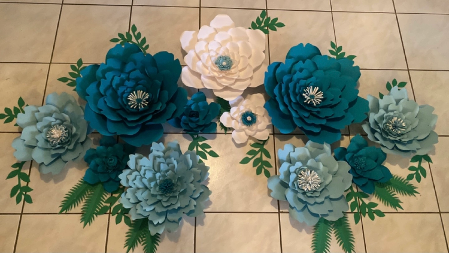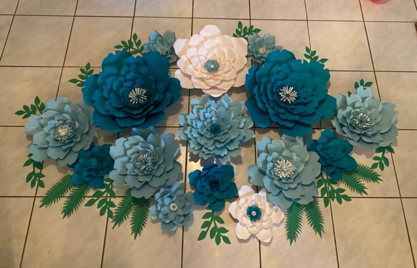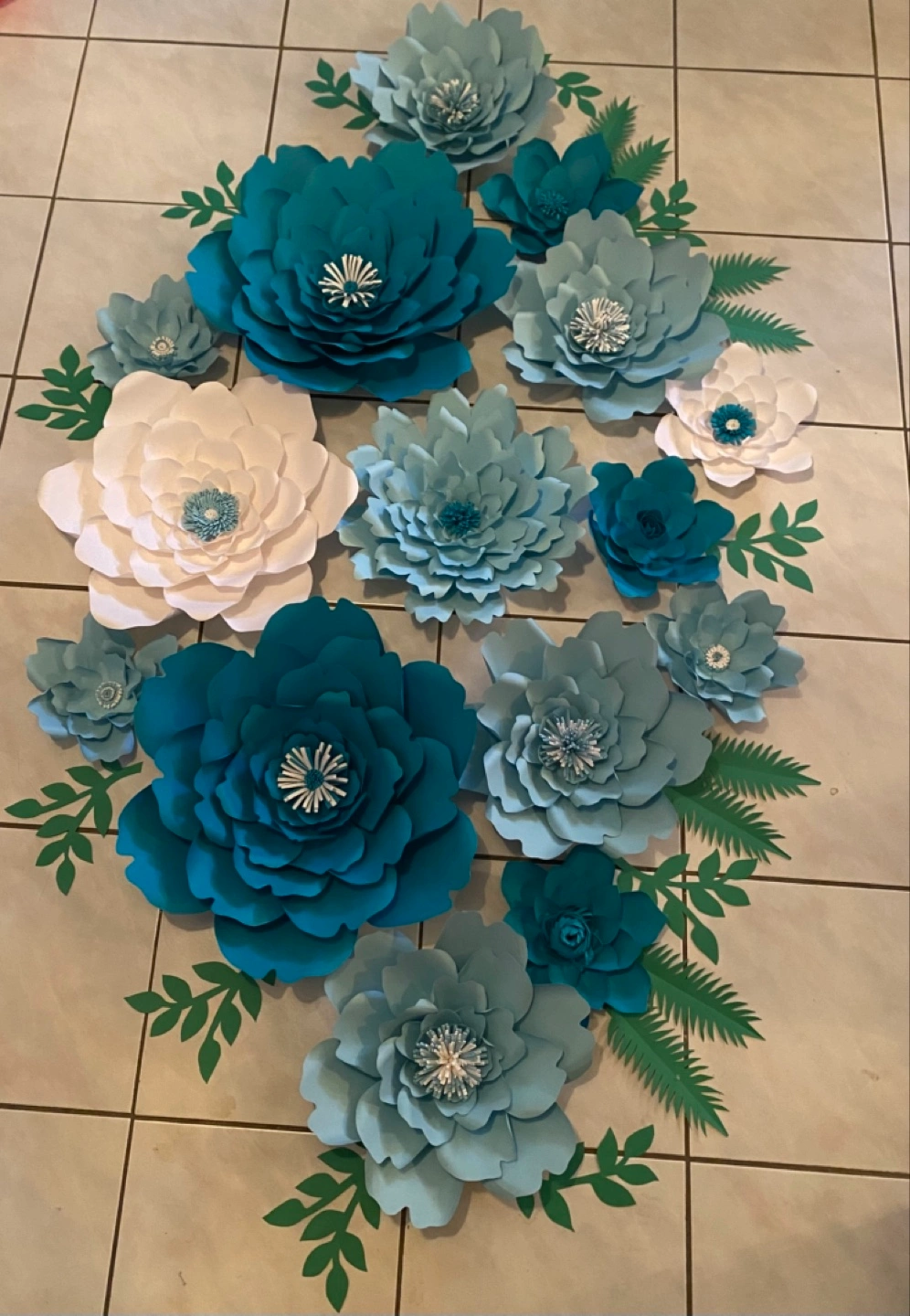 Set of large and small paper flowers. Various shades of teal, light blue and white. Includes greenery accents. Perfect for weddings, parties, birthdays, showers, bridal, baby nursery, office, store displays or home décor. Handmade. Pick up in the Jane and Church Streets Area. Cash only
