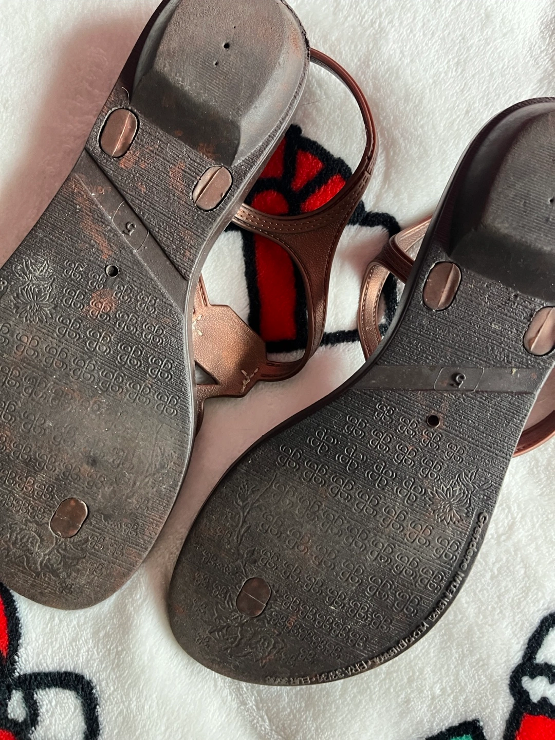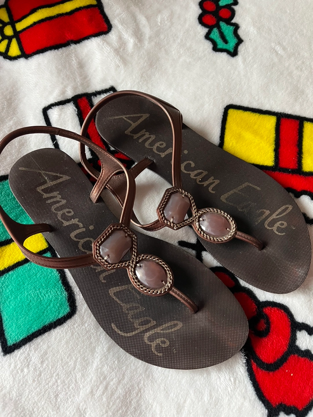 Brown thong sandals. Size 9. Features decorative stones. Slight wear.
