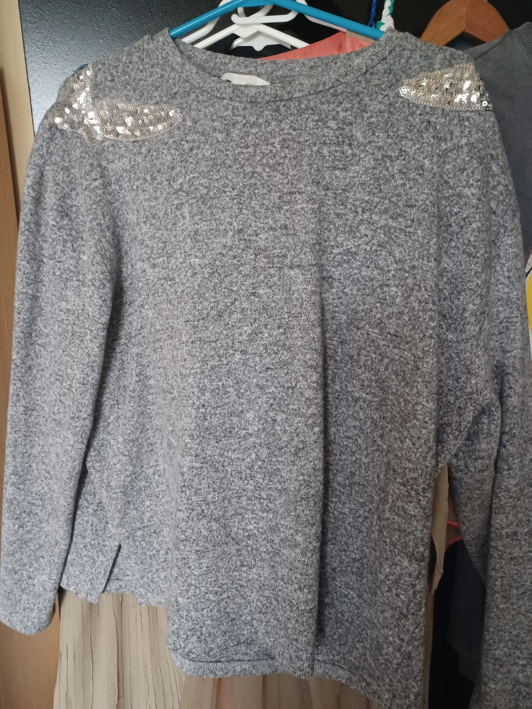 Grey long-sleeved sweater. Features silver sequin detailing on the shoulders and neckline. Cozy and stylish. Great for casual wear. yonge and Sheppard
