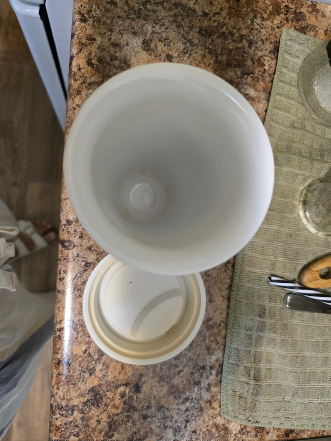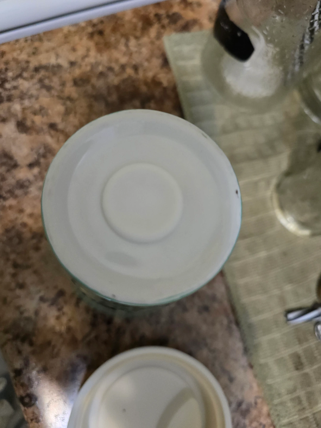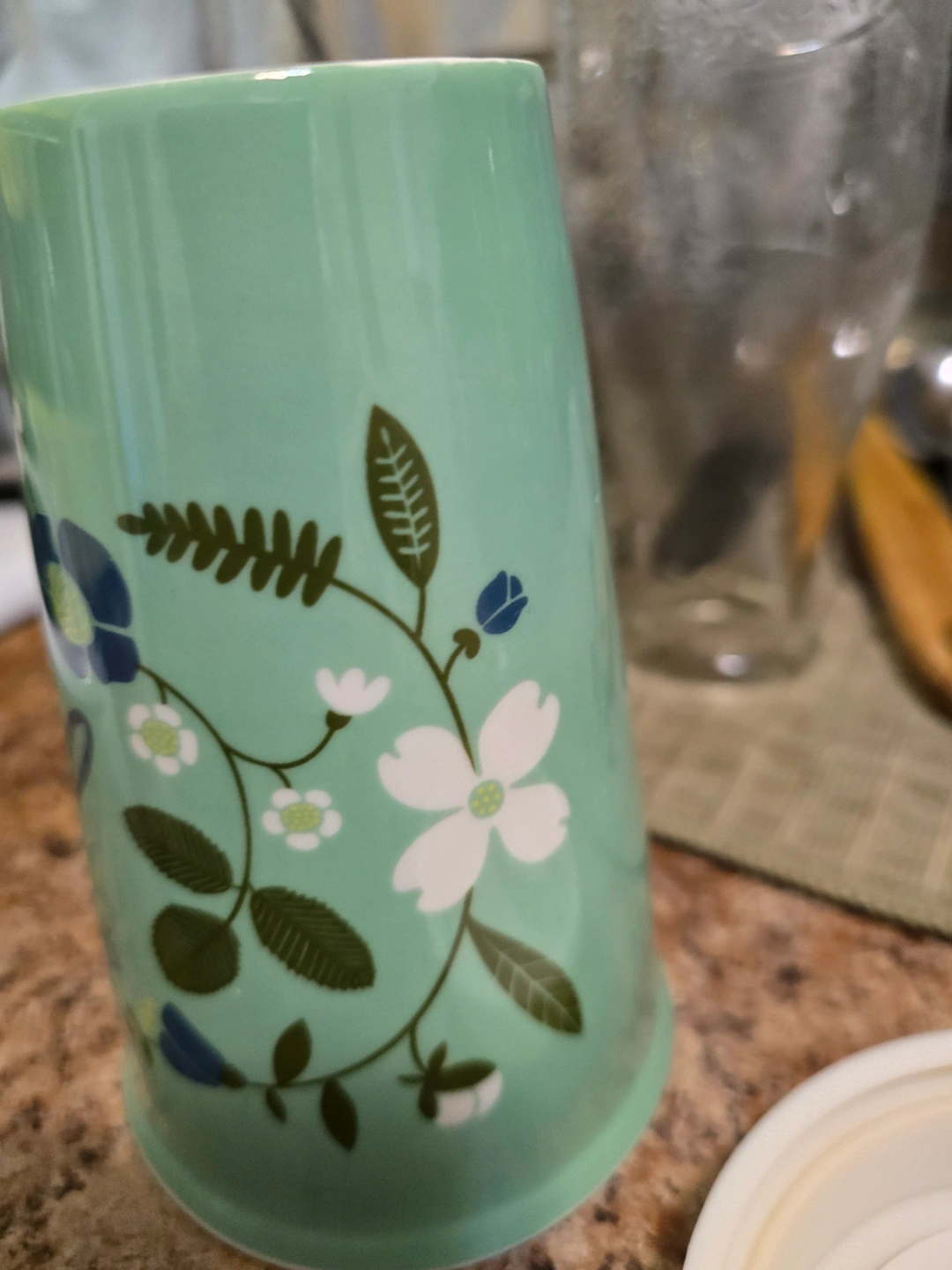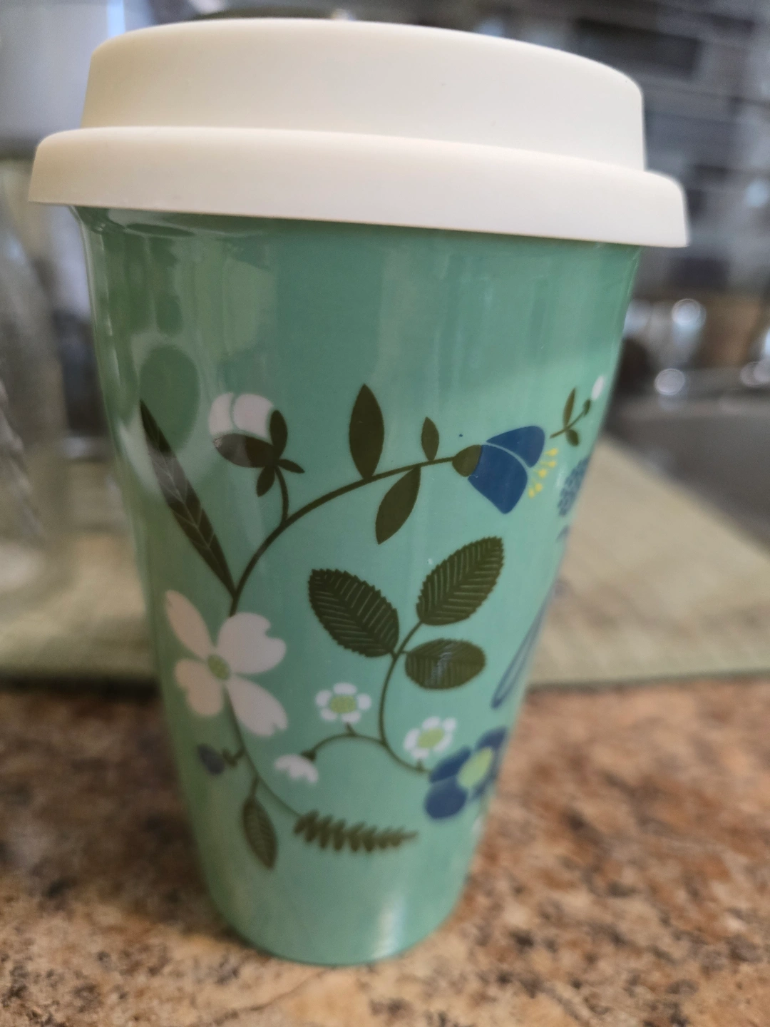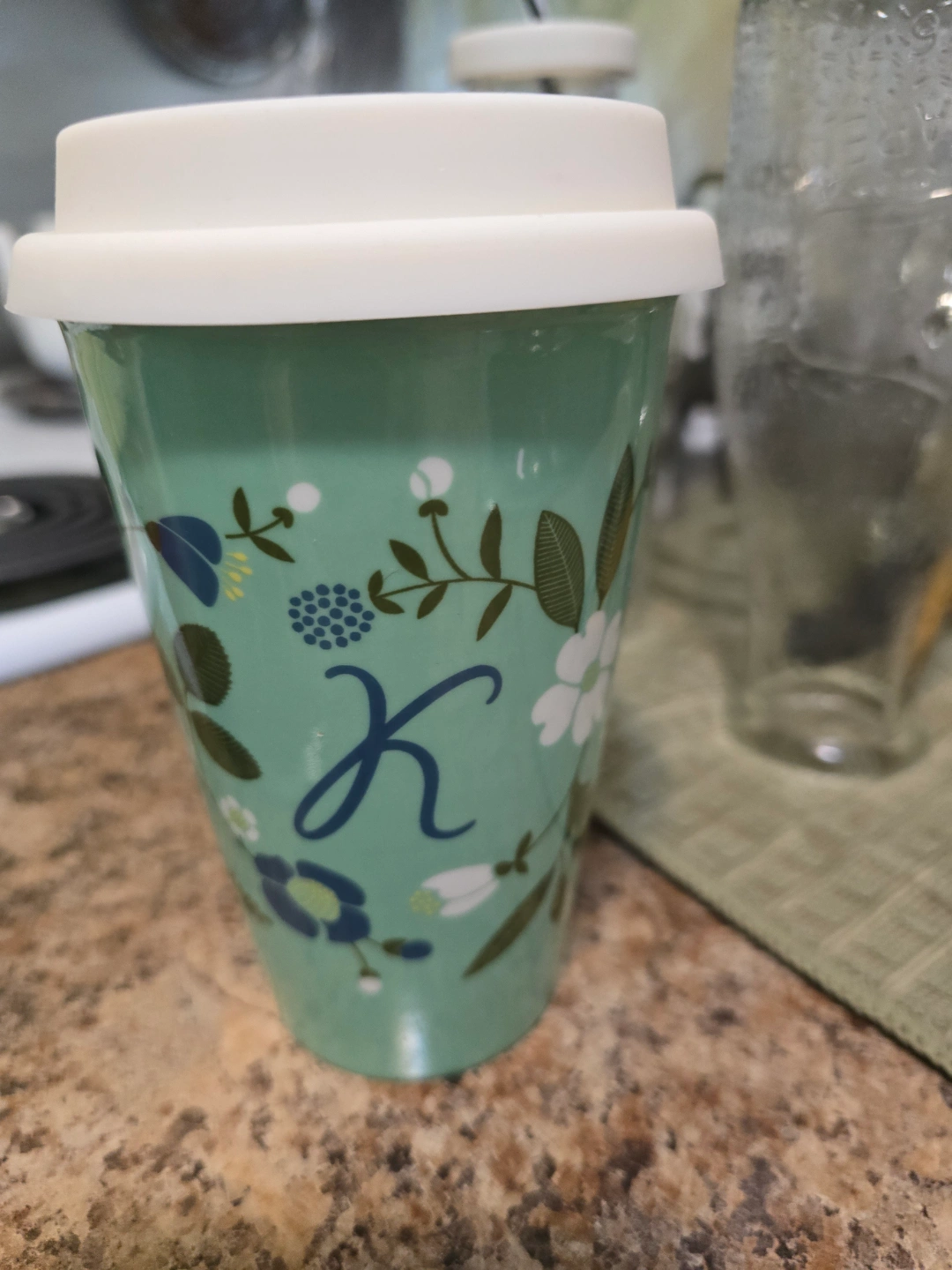 I will be moving soon! if you want this get it now! Hello "K" !!! Reusable ceramic travel mug. Features a teal base with floral and leaf pattern. Includes a white silicone lid. Personalized with a cursive letter K.