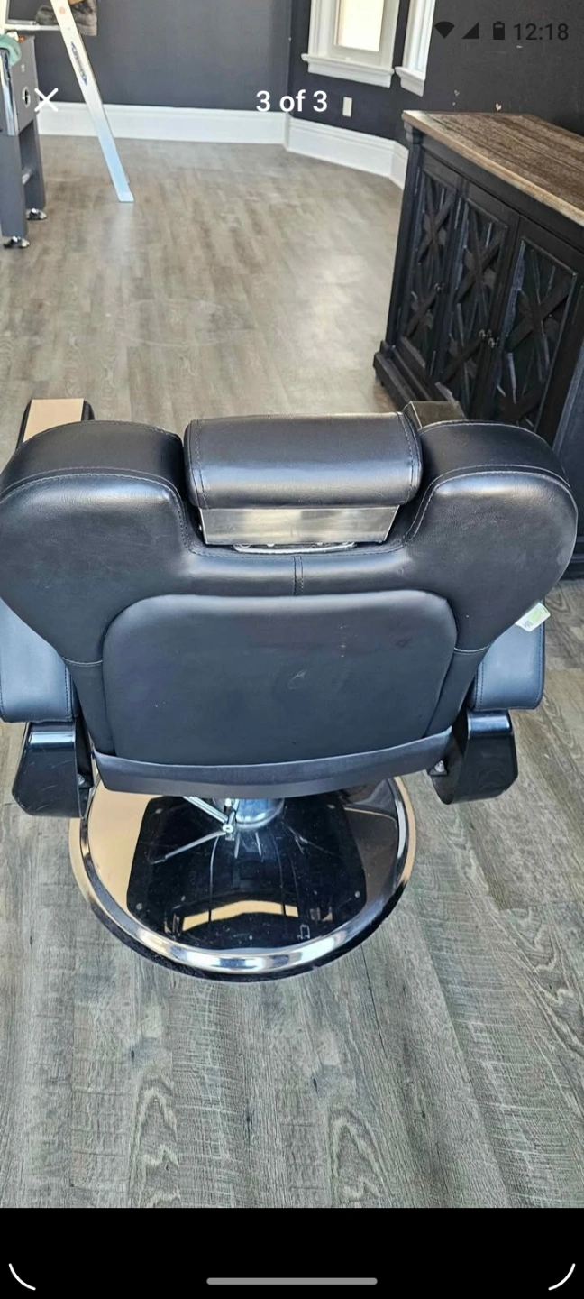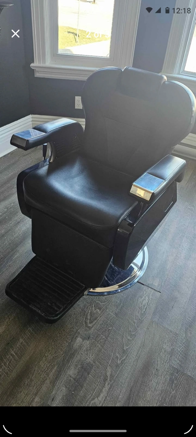 Black leather barber chair. Hydraulic lift. Chrome base. Adjustable headrest. Armrests. Footrest. Used condition but excellent! priced to sell Closed shop need gone asap!!! Pickup downtown barrie