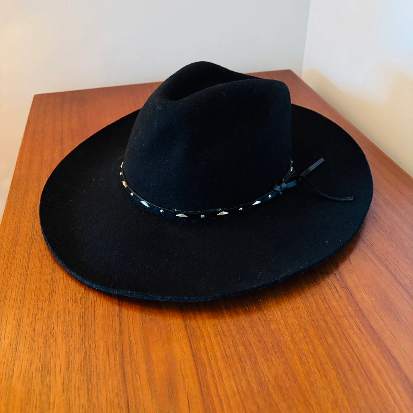 Black felt cowboy hat, with black leather band with silver studs. Interior features a satin lining with the Cody James logo, and a leather brim. Made in the USA. Good for size 7-1/8 and under, or 7-1/4 snug fit - good for riding a horse :)