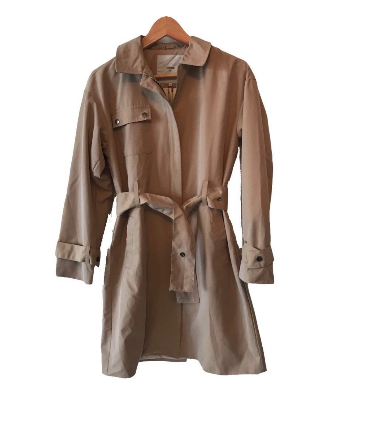 Beige trench coat. Belted waist. Long sleeves. Pockets. Lined. Size 36. Beige trench coat with a belt. Lined. Two pockets. Long sleeves with button cuffs. -Minimum -Trench coat -Belt -Pockets -Cotton poly blend -Zip front. Colour: Khaki/ brown Measurements: Pit to pit 19”, waist 17”, length 34” Size: Euro 36/S New with tags. Not thrifted.