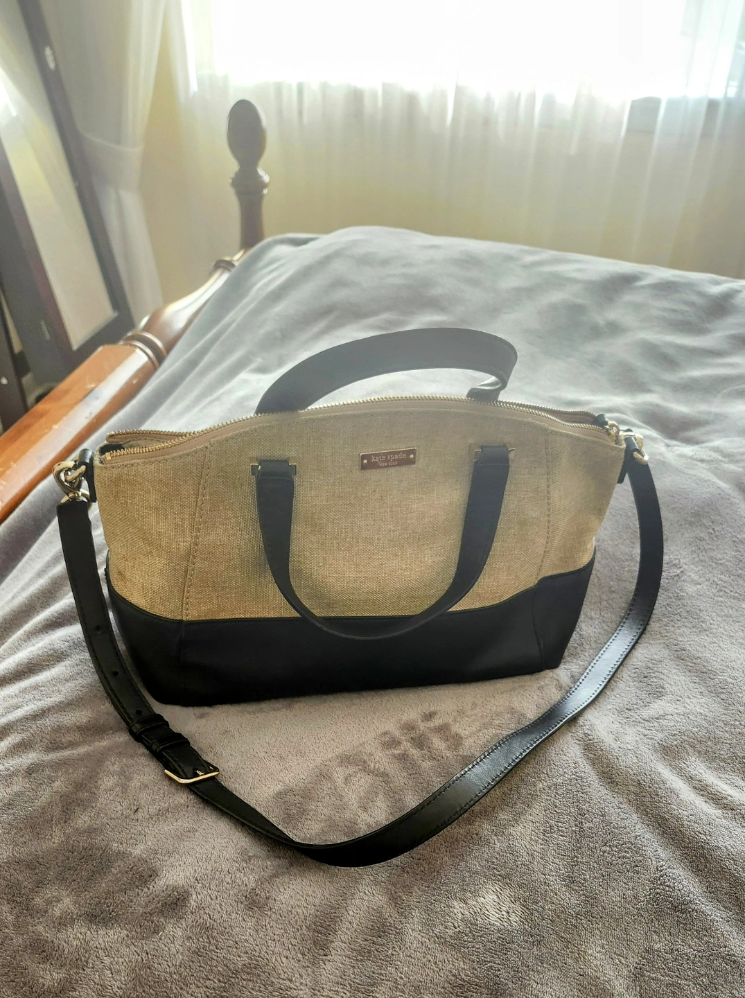 Beige and black handbag. Top handles and a long shoulder strap. Zip closure. Fabric and leather.