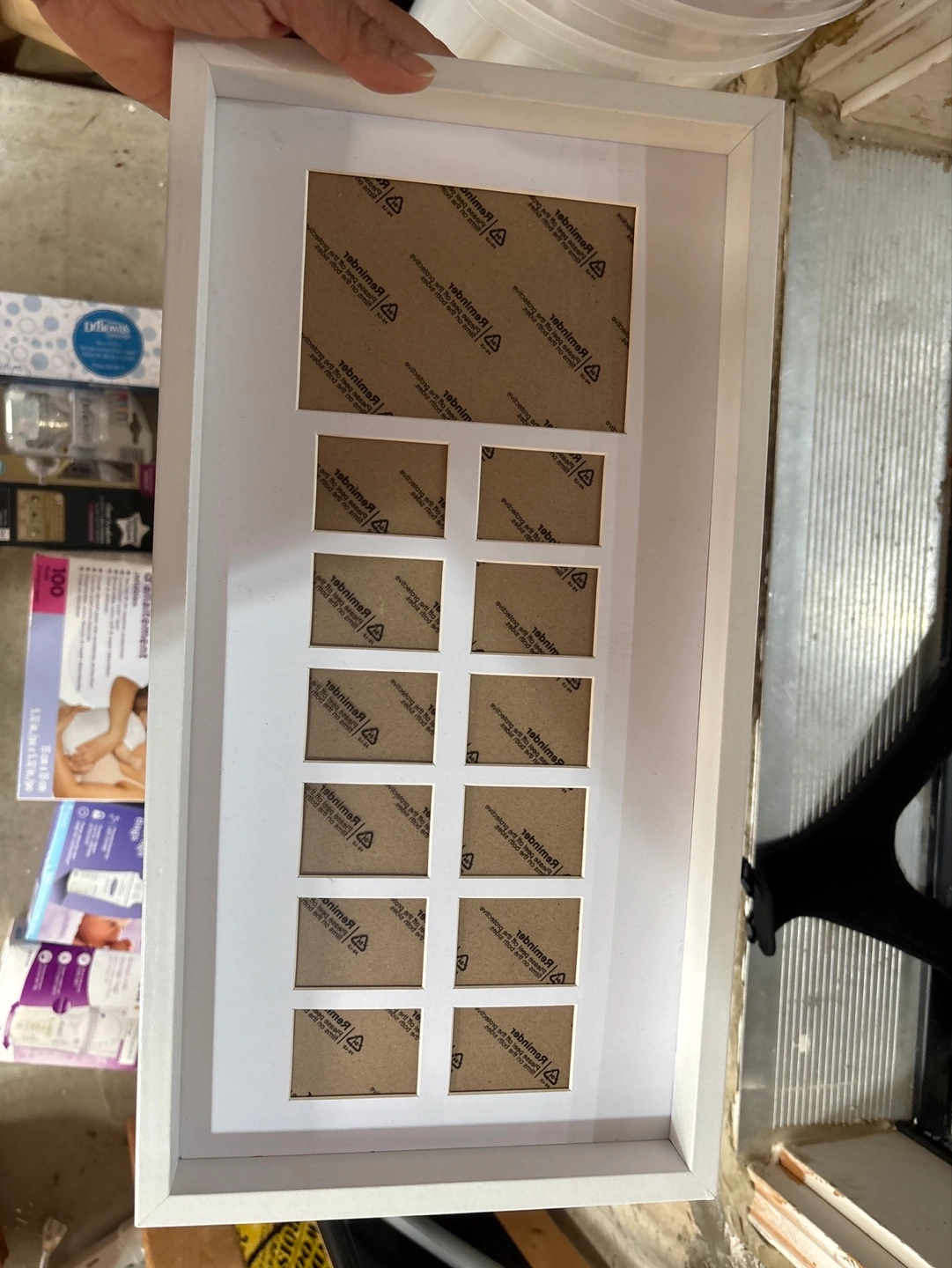 White picture frame, holds 12 small(each month) photos and one first birthday picture . Perfect for displaying memories. New condition.