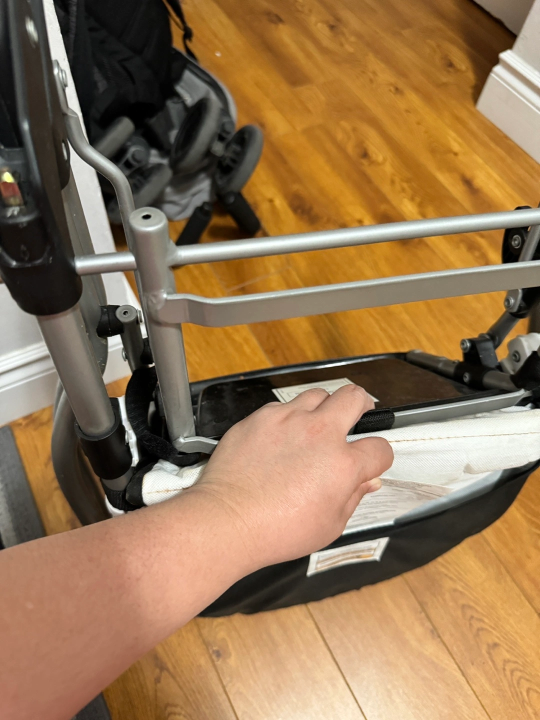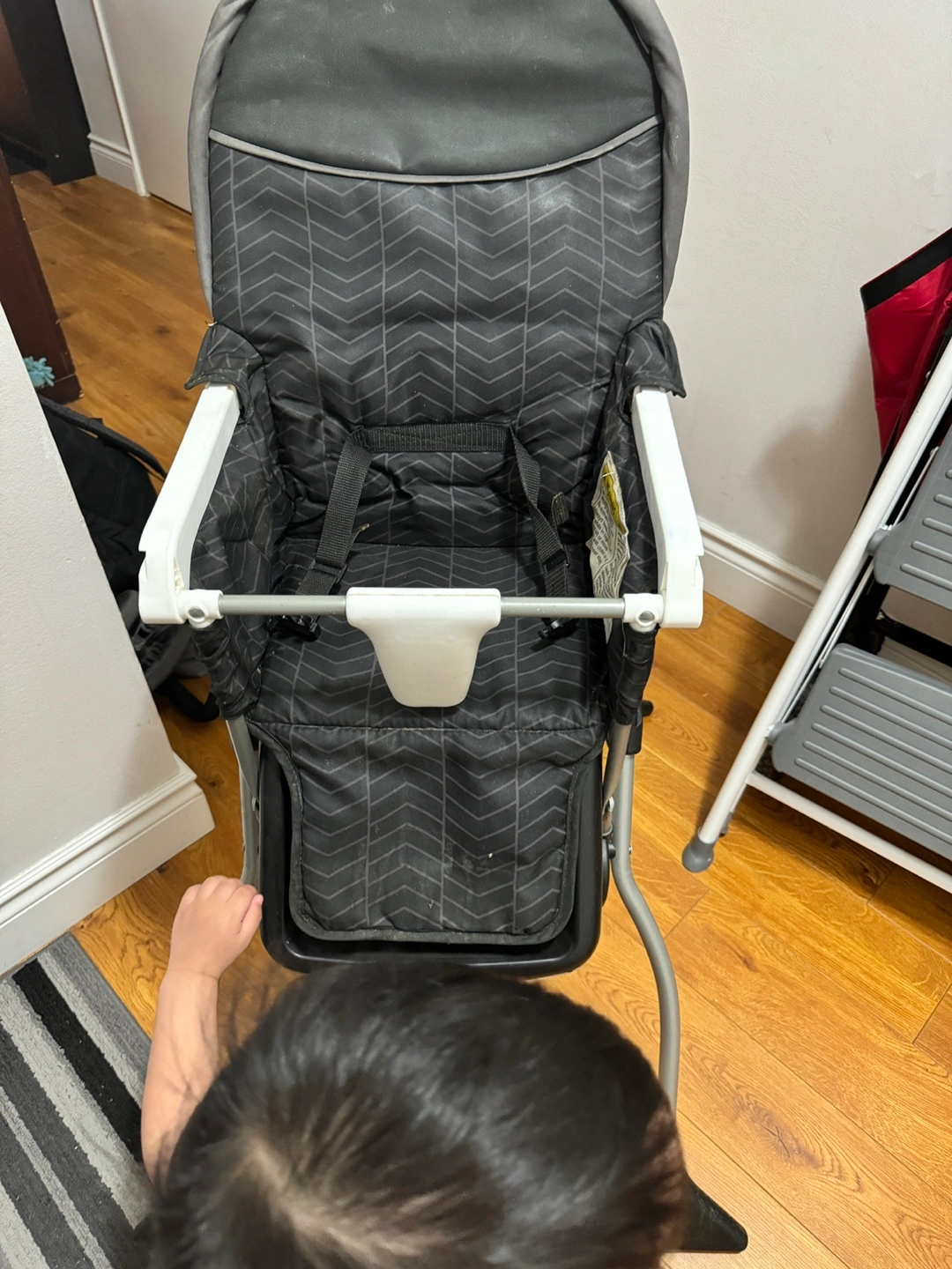 Foldable high chair. Grey and black chevron pattern. Easy to store. Tray included. Suitable for toddlers.gently usedy Cosco brand