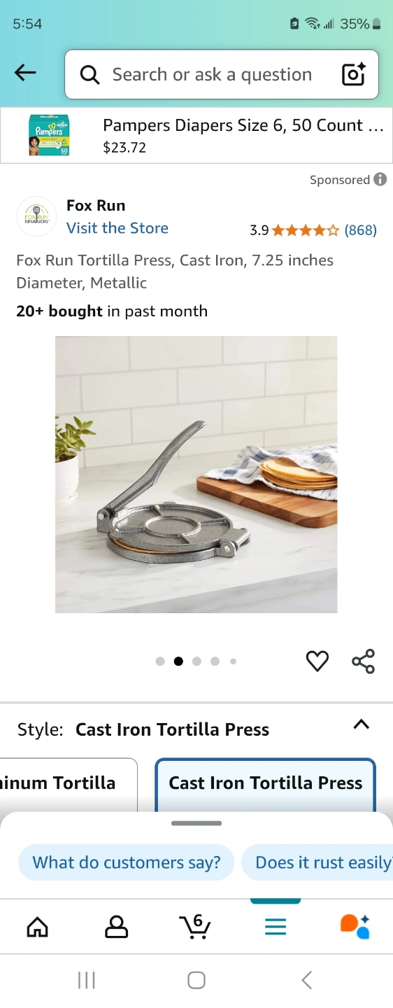 Cast iron tortilla press. 7.25 inches in diameter. Metallic finish.