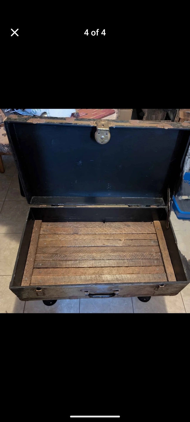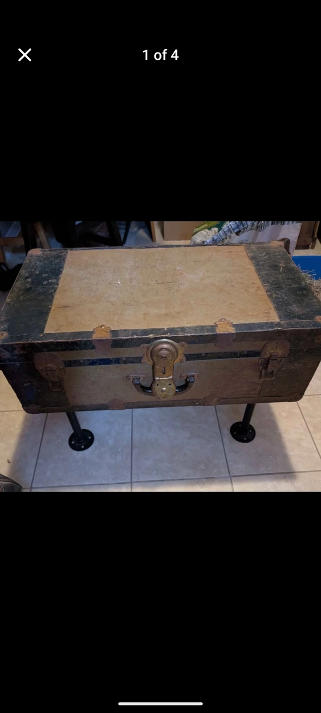 Unique coffee table, repurposed vintage trunk. Metal frame, wood interior. Industrial pipe legs. Great conversation piece.