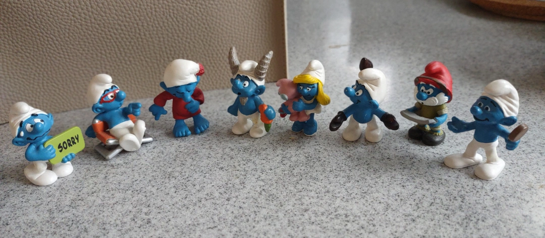 Set of seven vintage Smurf figurines. Various poses and characters. Collectible Smurfs. Great for fans. I bought in Montreal INDIGO book store. . I paid each $5-12+tax. I want to sell together.