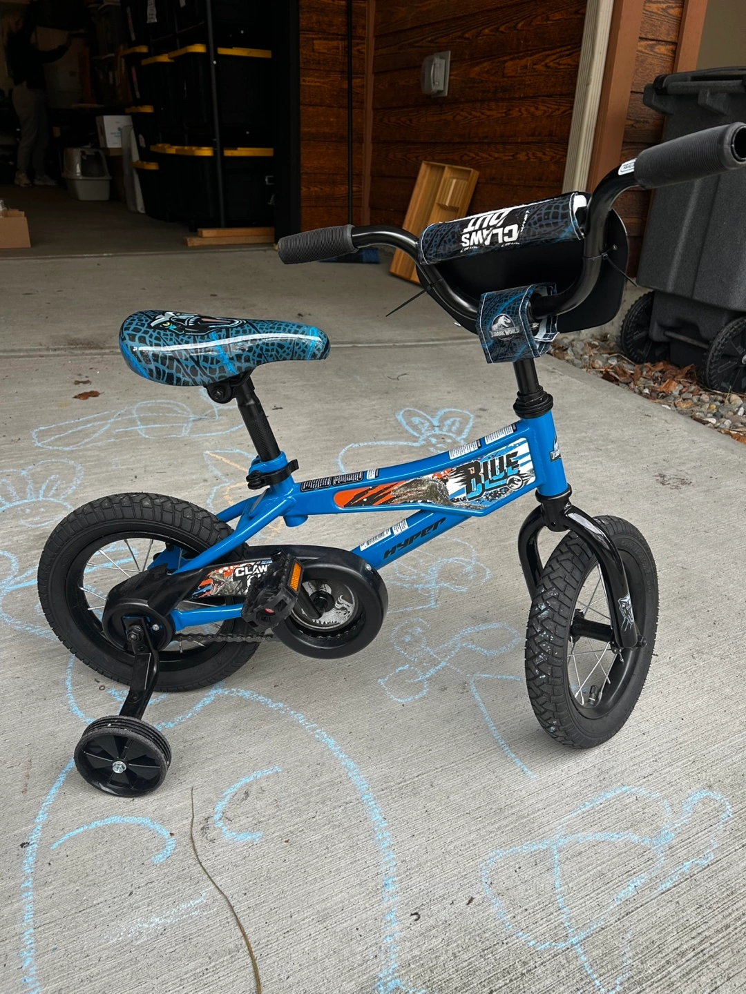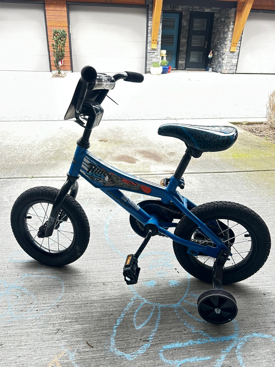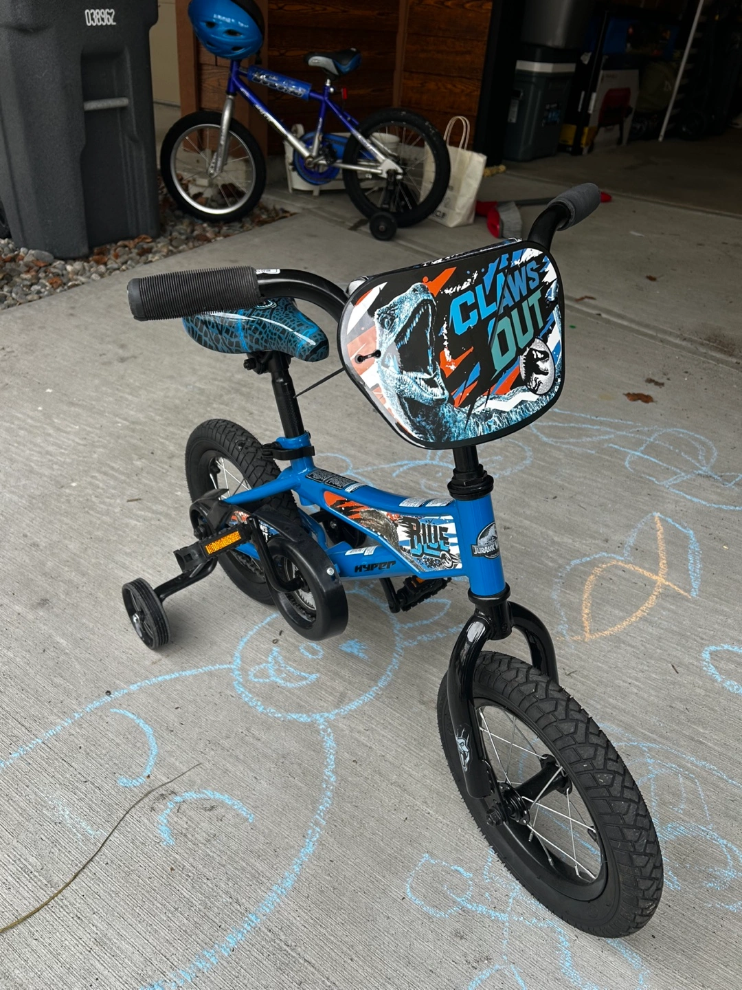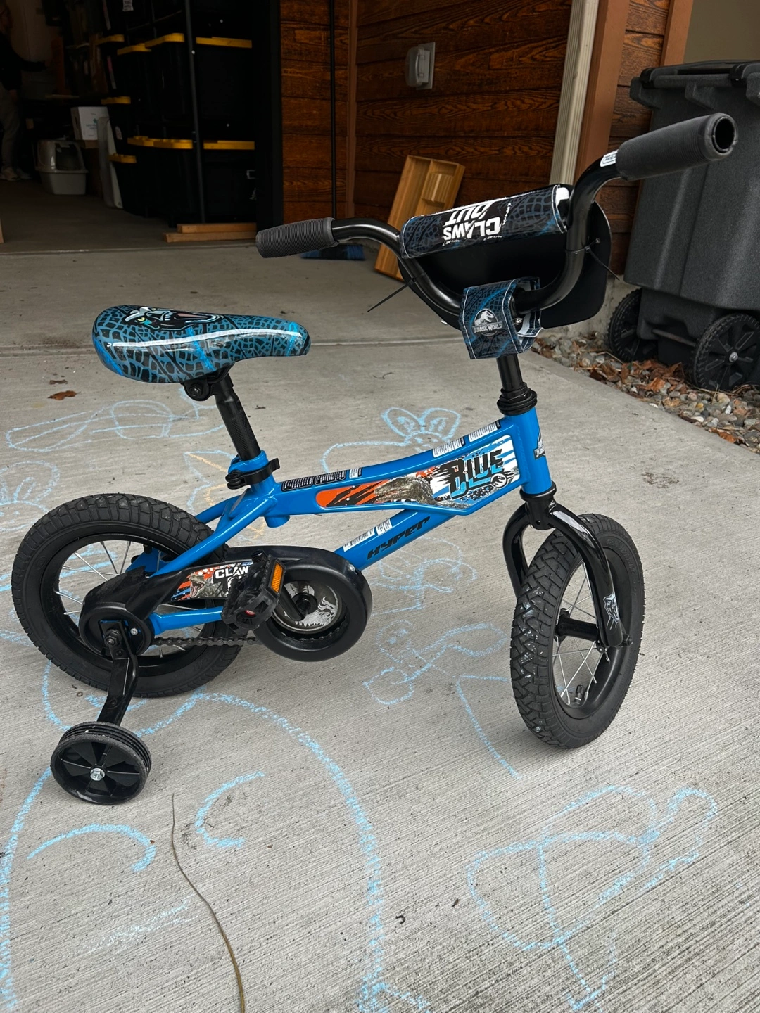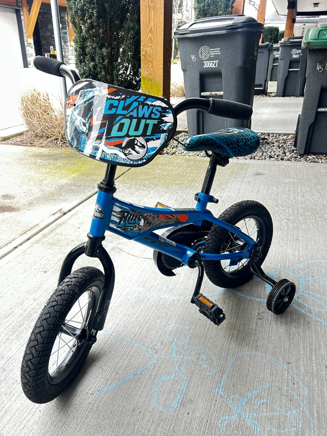 12 inch wheel kids' bike. Blue frame with Jurassic World design. Includes training wheels. Great for young riders.