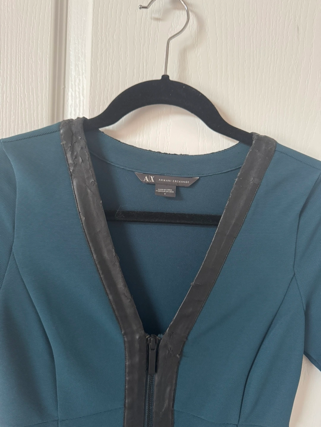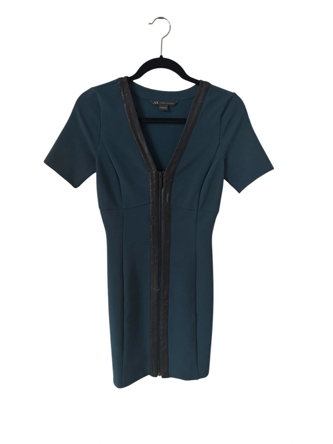 Dark teal mini dress. Short sleeves. V-neck. Features a black leather-look zipper detail down the front. Size small.