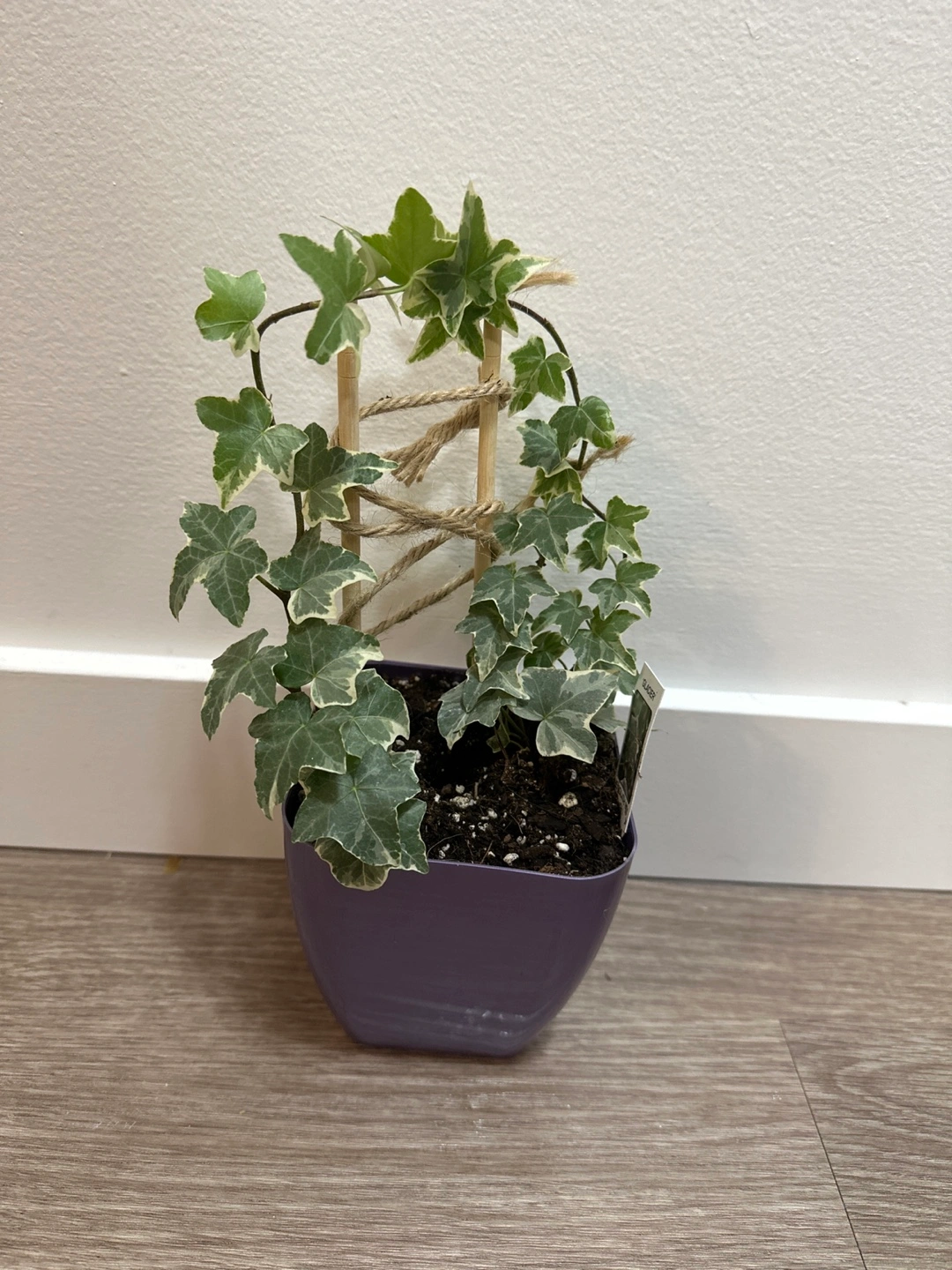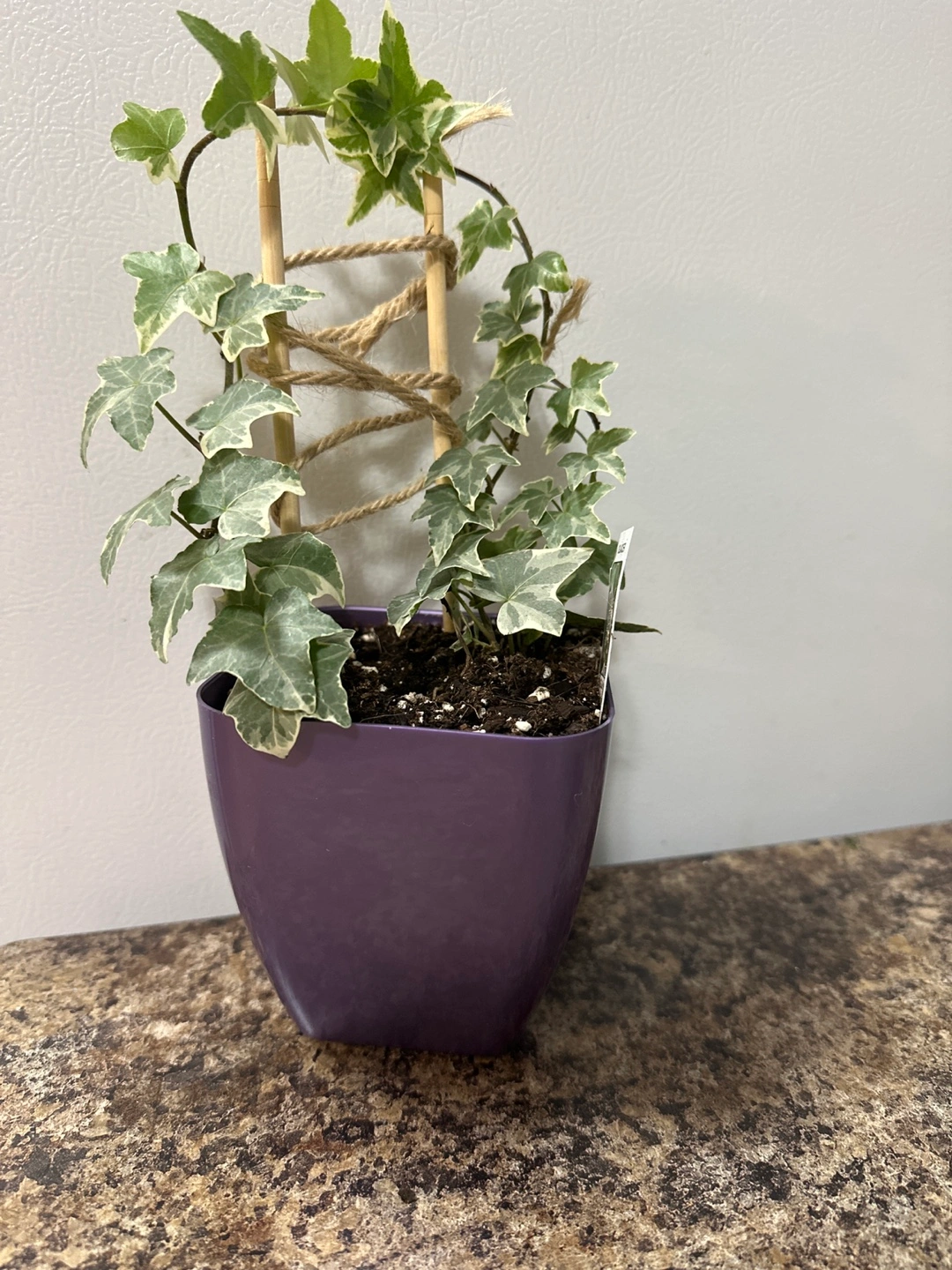 Healthy variegated English ivy plant. Small purple plastic pot. Bamboo trellis and twine included. Great addition to any home.