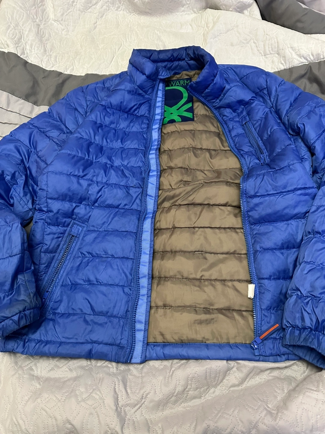 Men's blue quilted jacket. Size 50. Features a high collar and zipper closure. Multiple pockets. Machine washable. Made in China. Pay by cash please