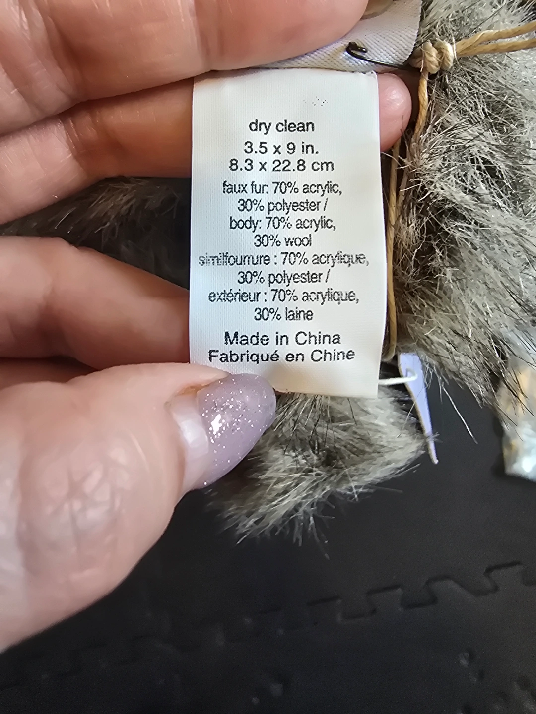 Pair of grey knit gloves. Features a faux fur cuff. New with tags. Dry clean only. 70% acrylic, 30% polyester body. 70% acrylic, 30% wool faux fur.