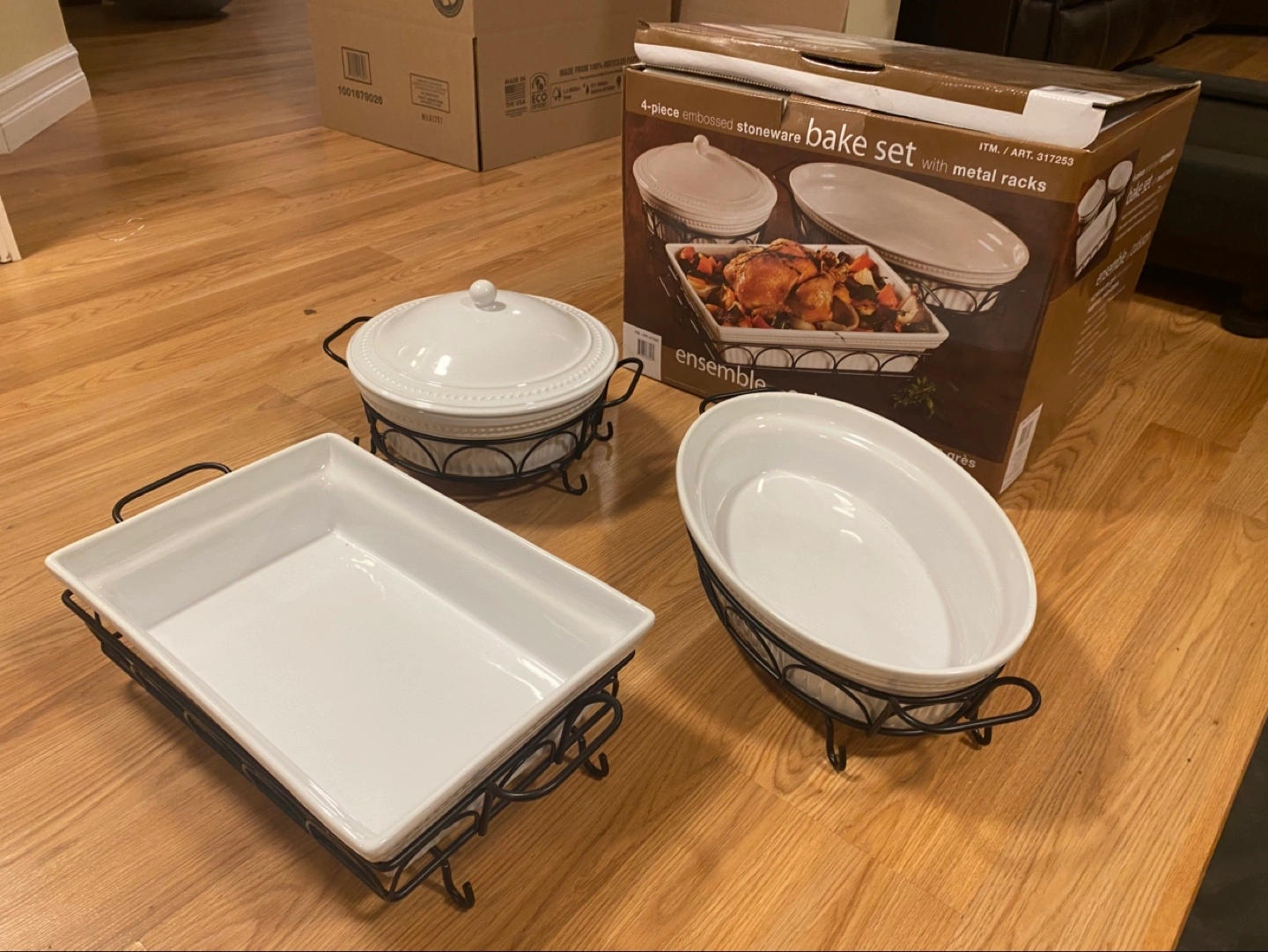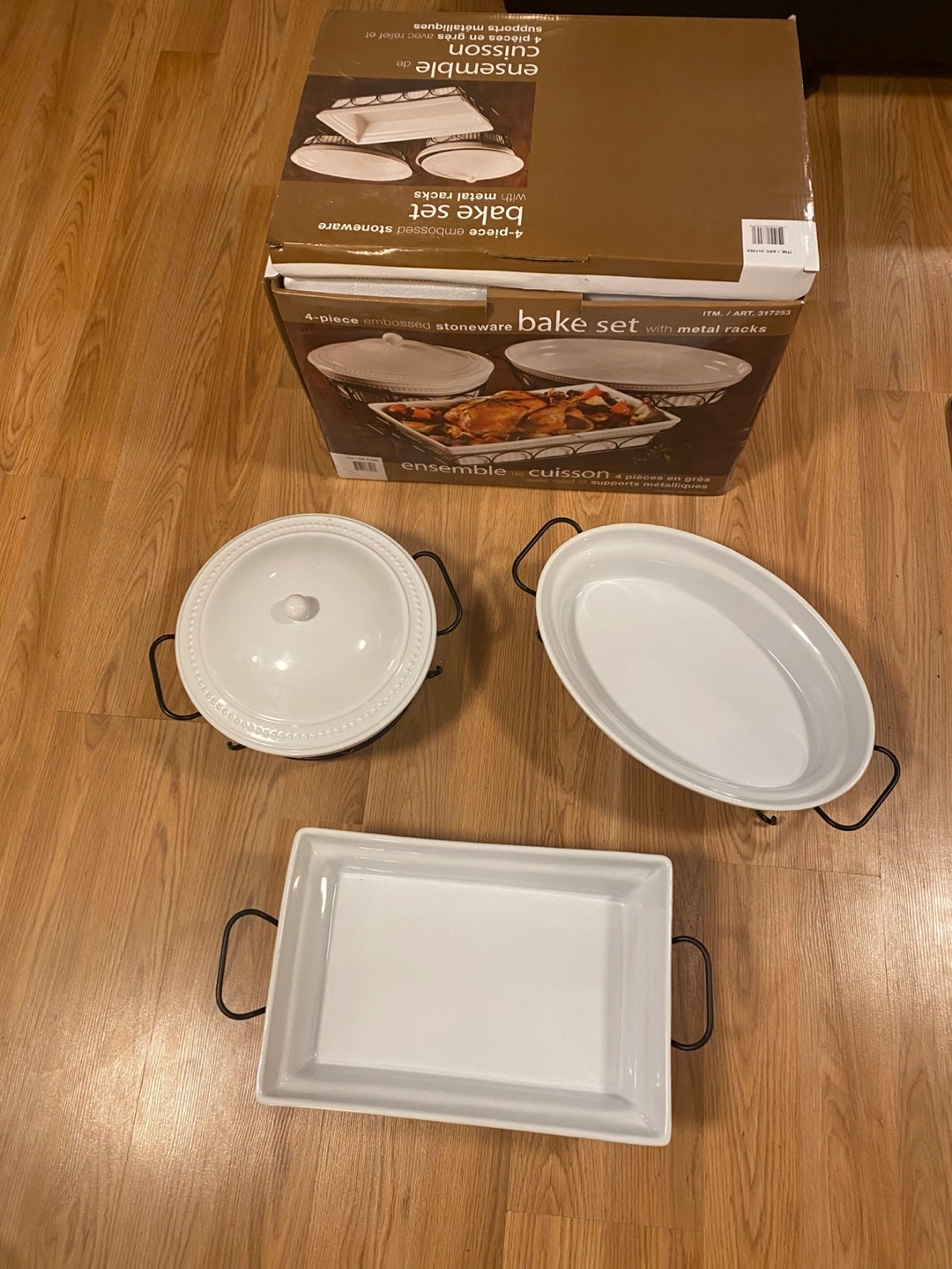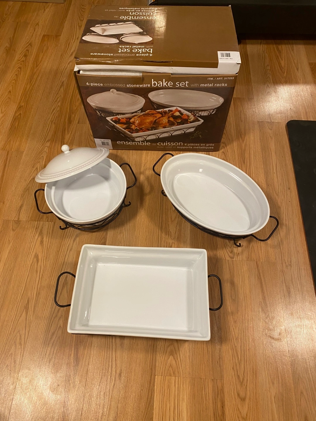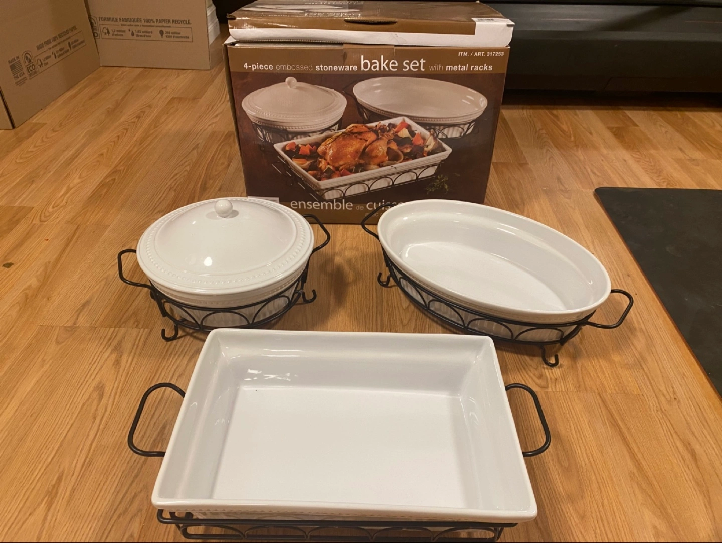 Four-piece embossed stoneware bake set. Includes metal racks. Oval baker, square baker, and covered casserole dish. In box