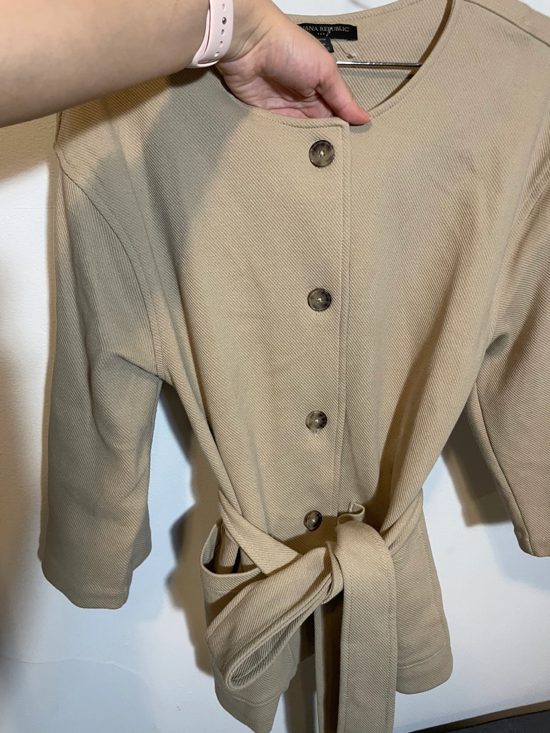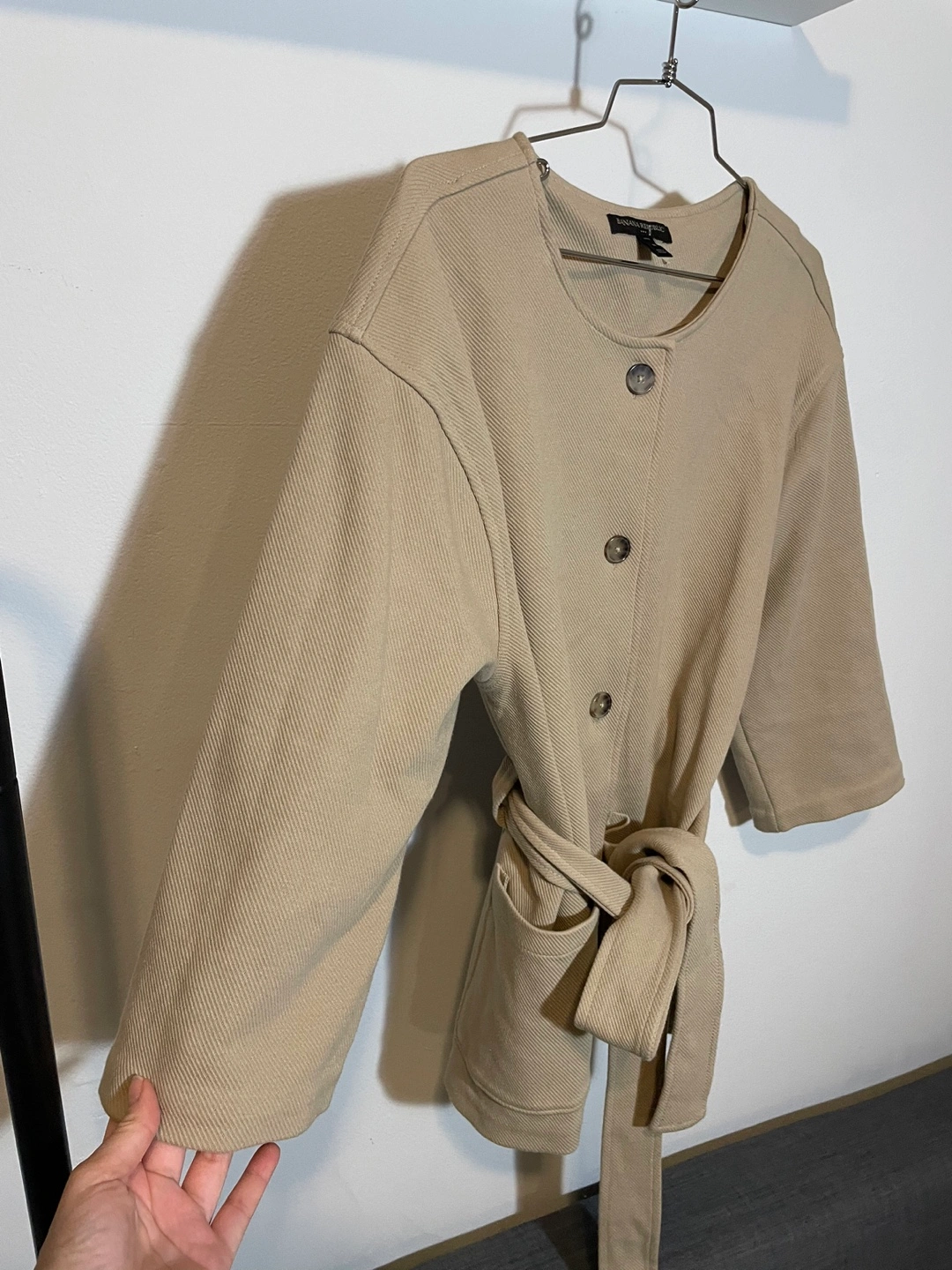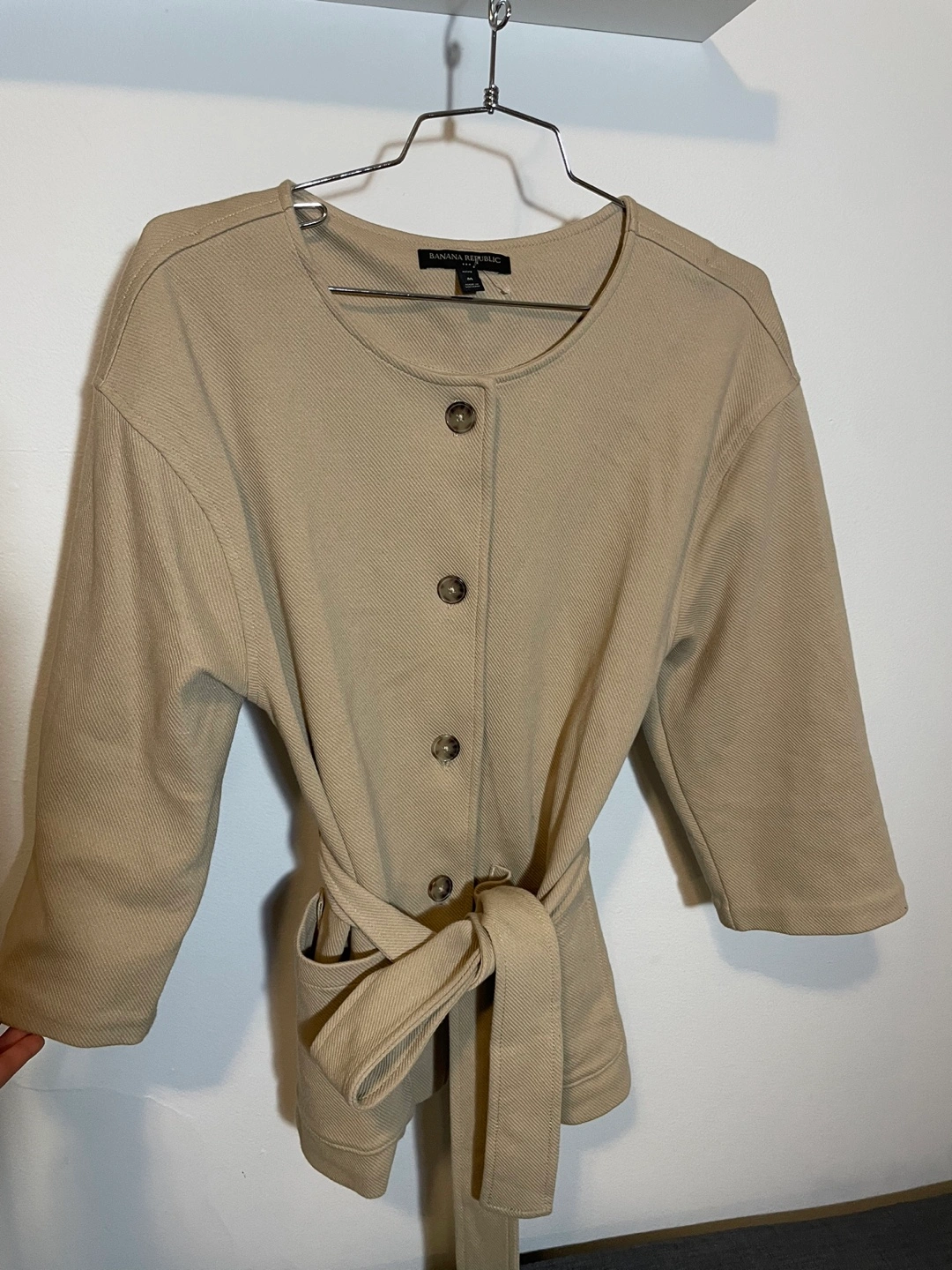 Women's beige button-up jacket. Three-quarter sleeves, pockets, and a self-tie belt. Relaxed fit. If the ad is still on is AVAILABLE Pick up at Dufferin and st Clair See my other listings for a bundle pricing if interested in another item :) Cash only