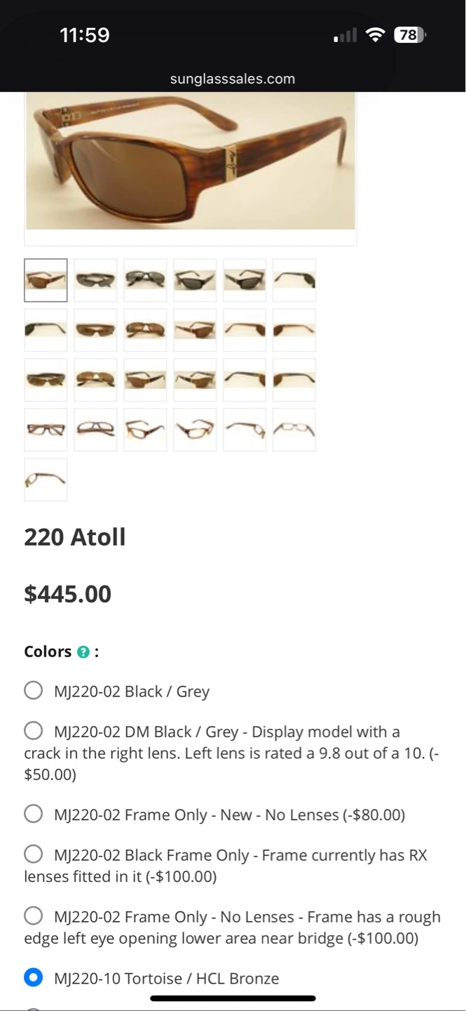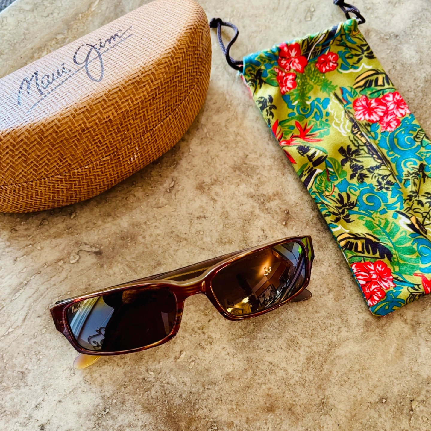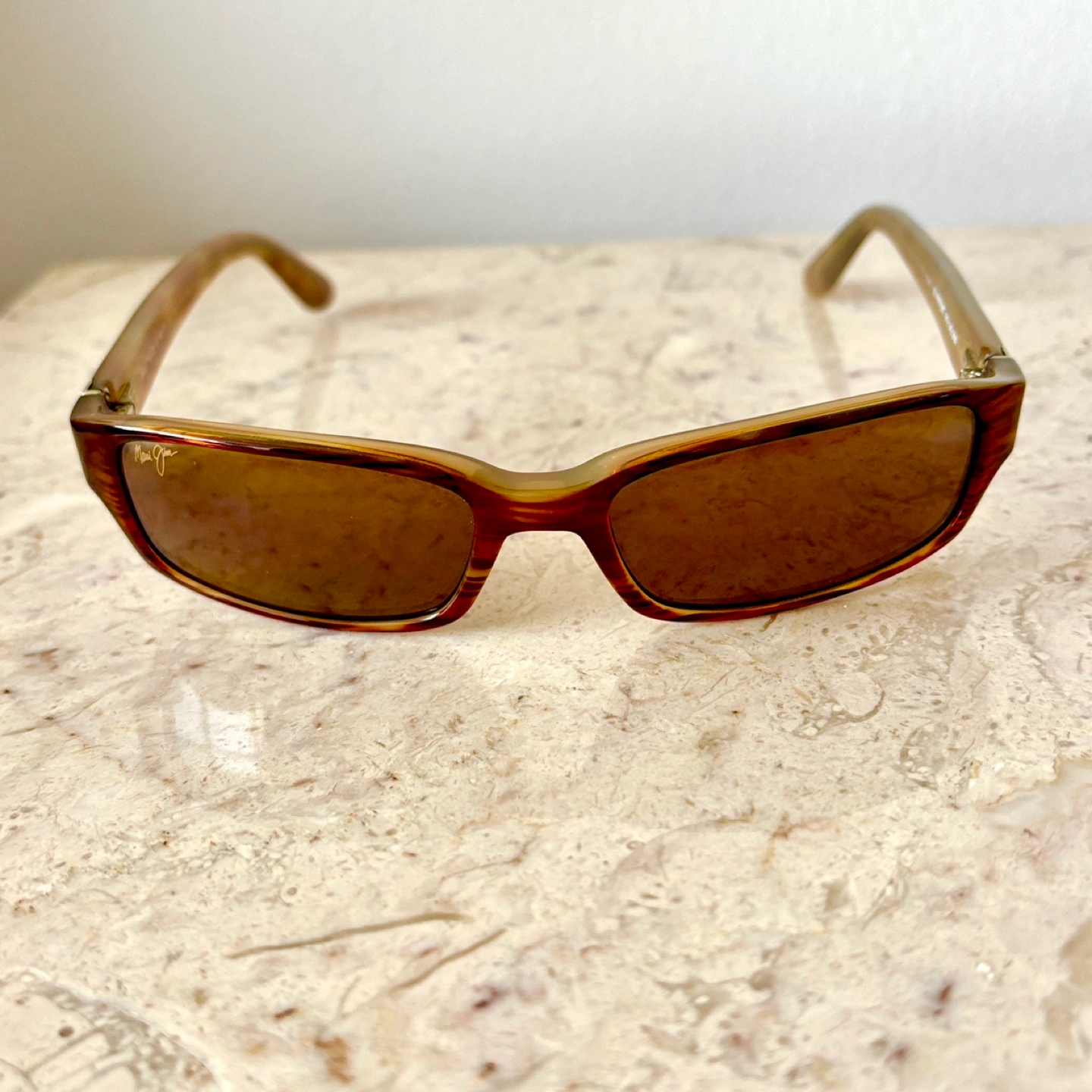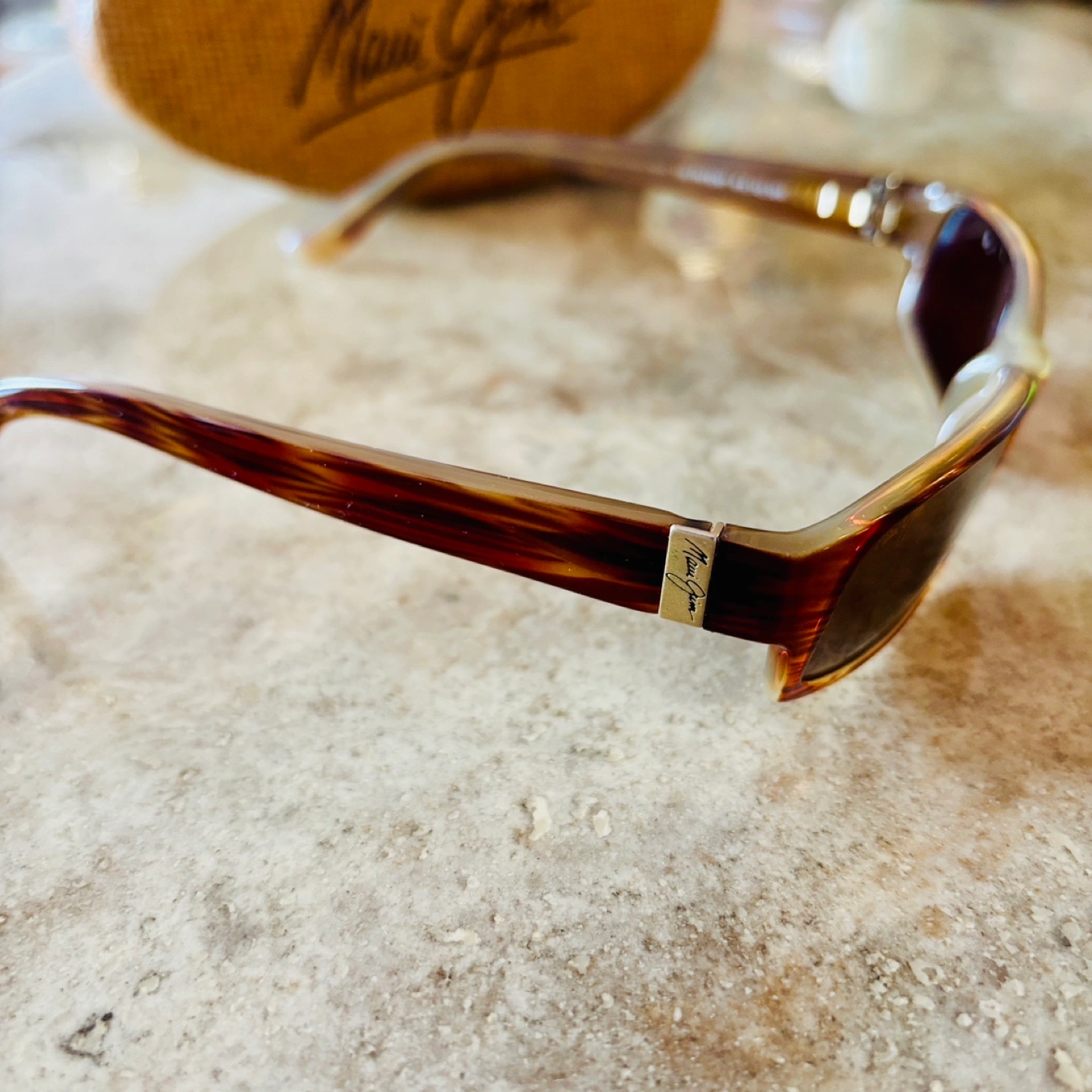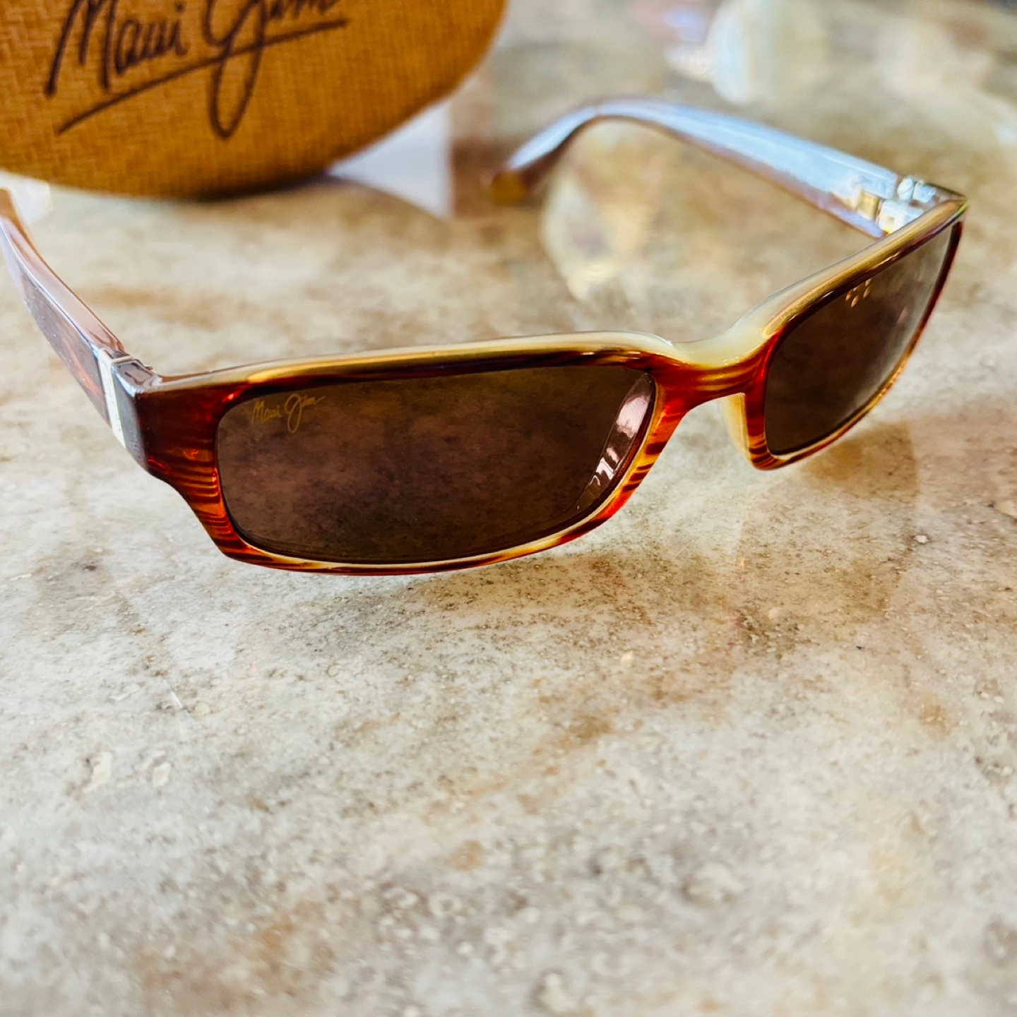 Super sleek and timeless look. Rare model. High quality Maui Jimβs at a fraction of the price. Clearing out my collection as I need prescription now π€ Tortoise shell frame has incredible detail and contrast, so much they call them Tiger Frames. Paired with a bronzed polarized lens these are perfect. Includes case and cleaning cloth (which is a second soft cloth case). Babied and kept in excellent condition. Looks amazing on men or women.