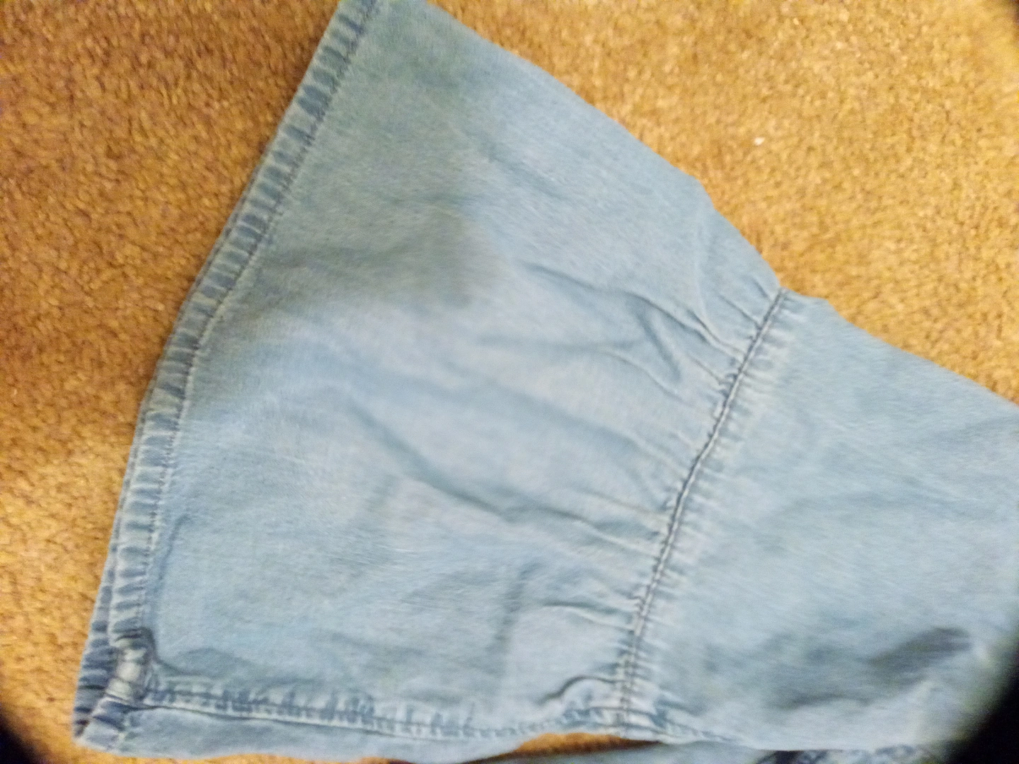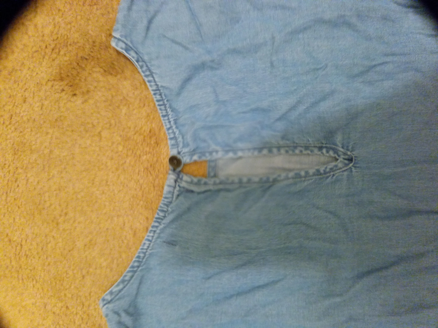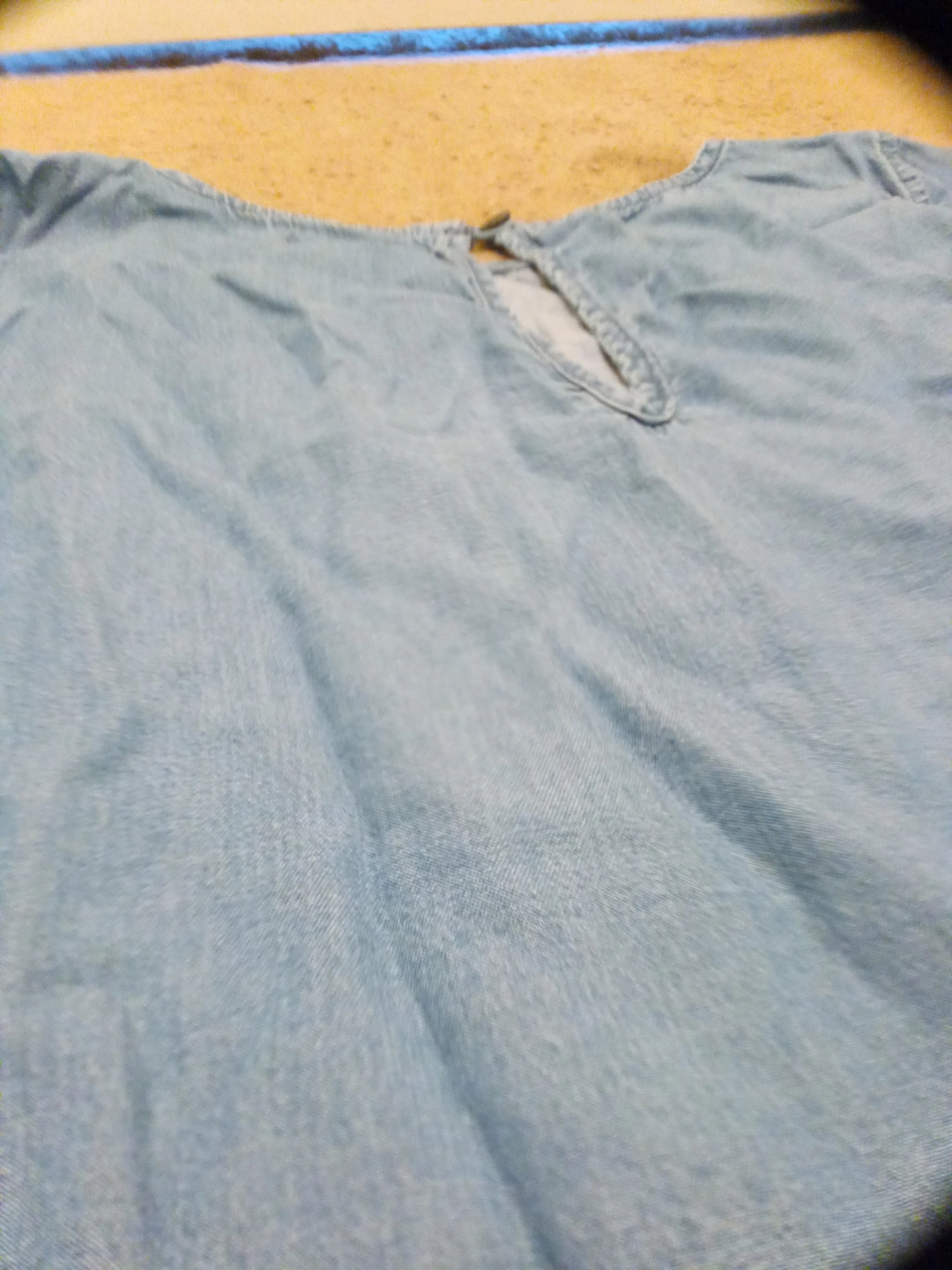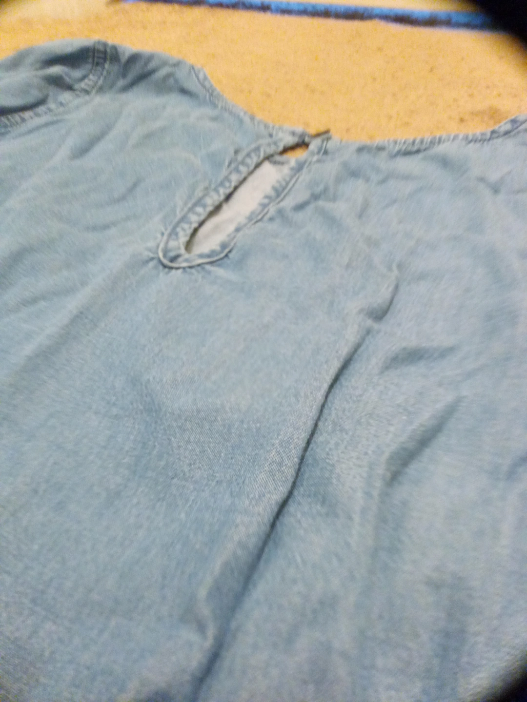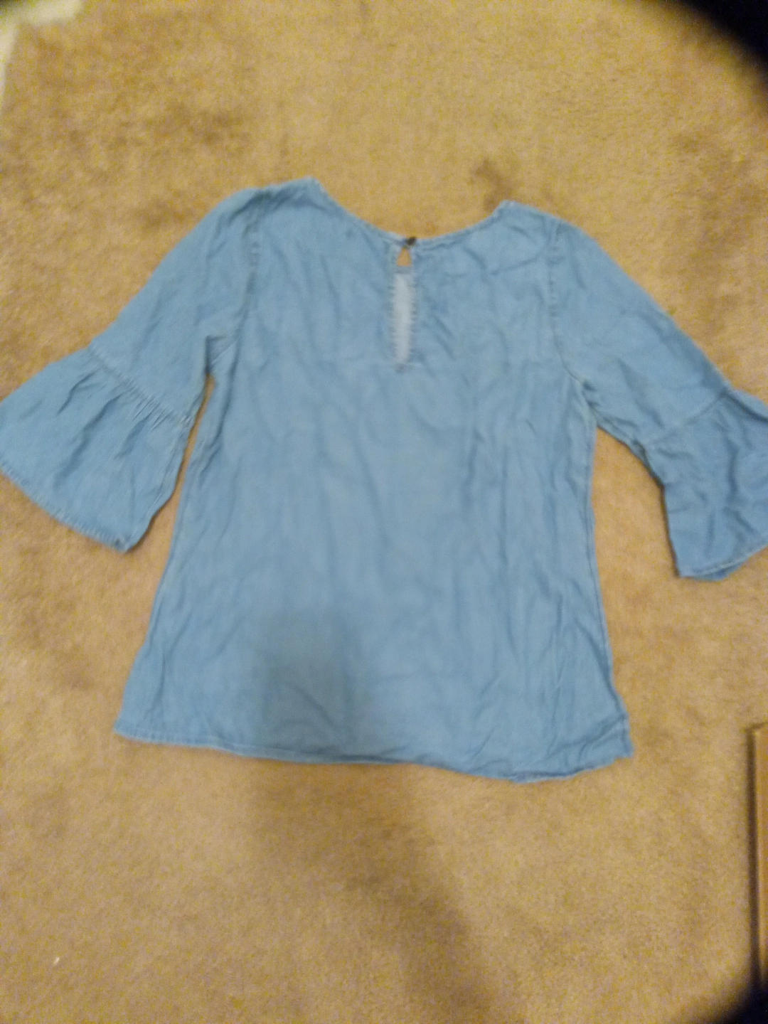 Bell sleeve denim top. Keyhole back detail. Three quarter sleeves. Light wash denim.