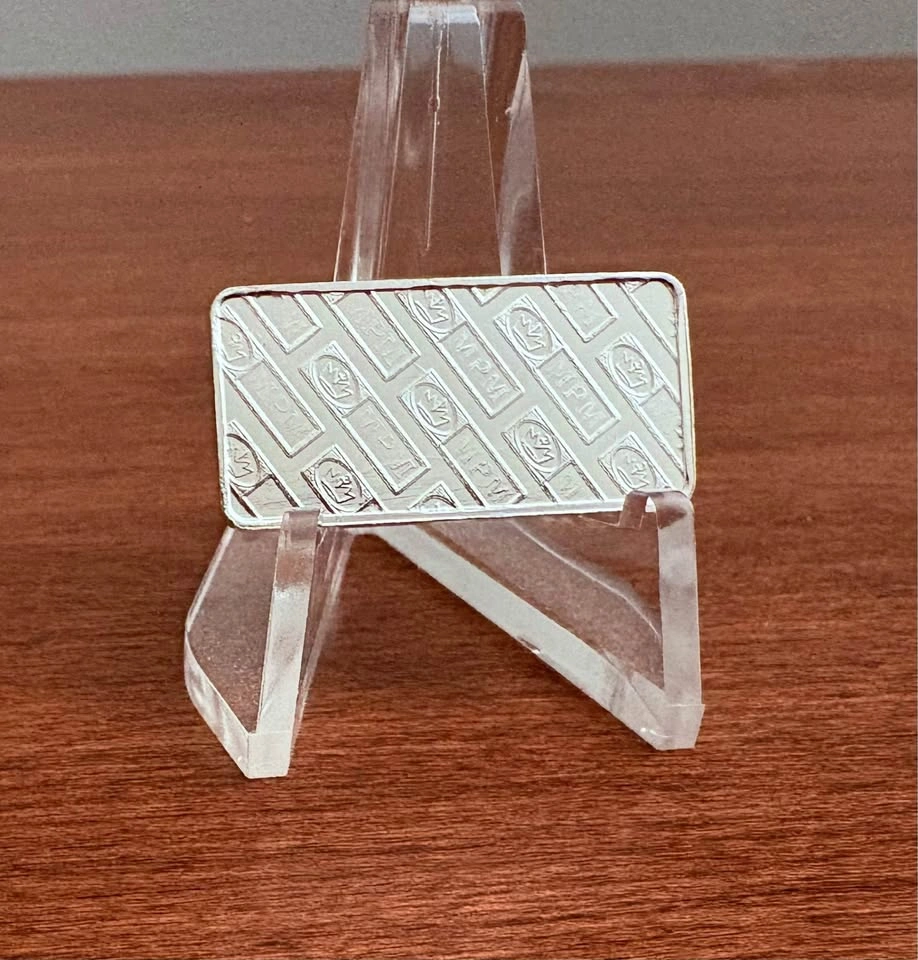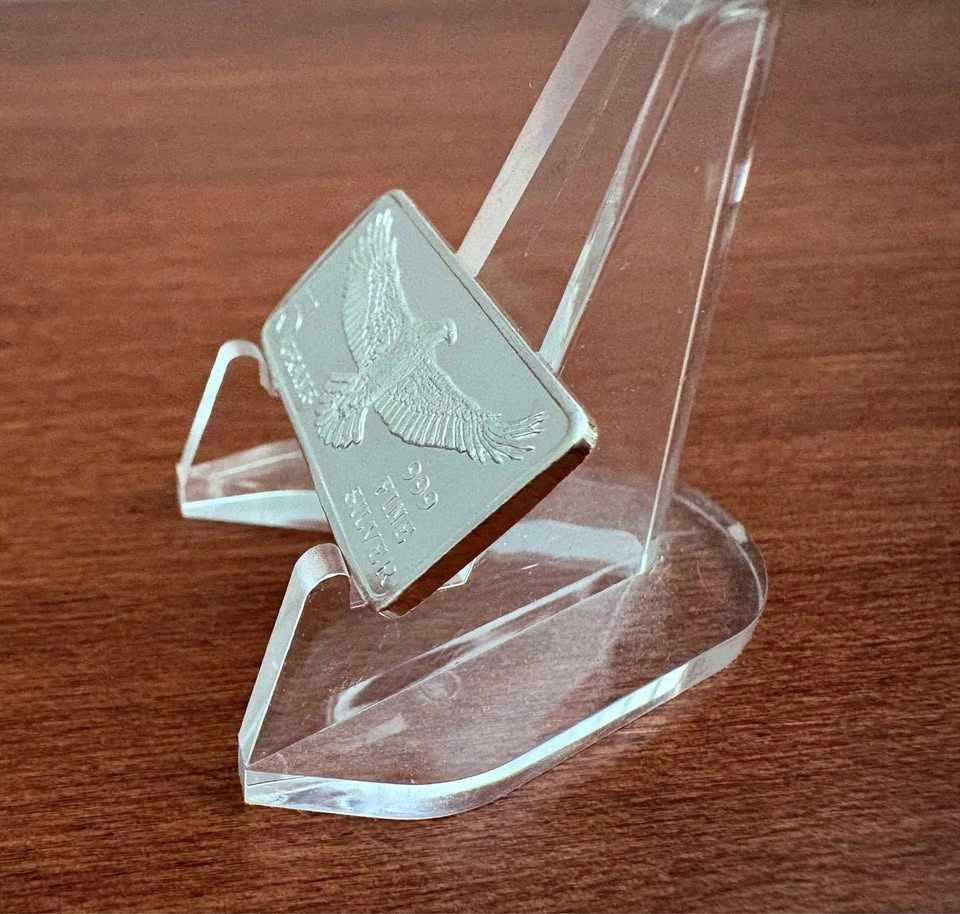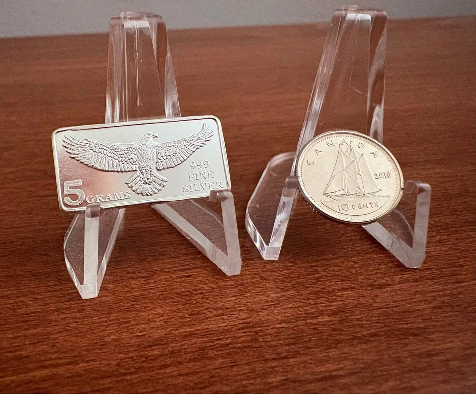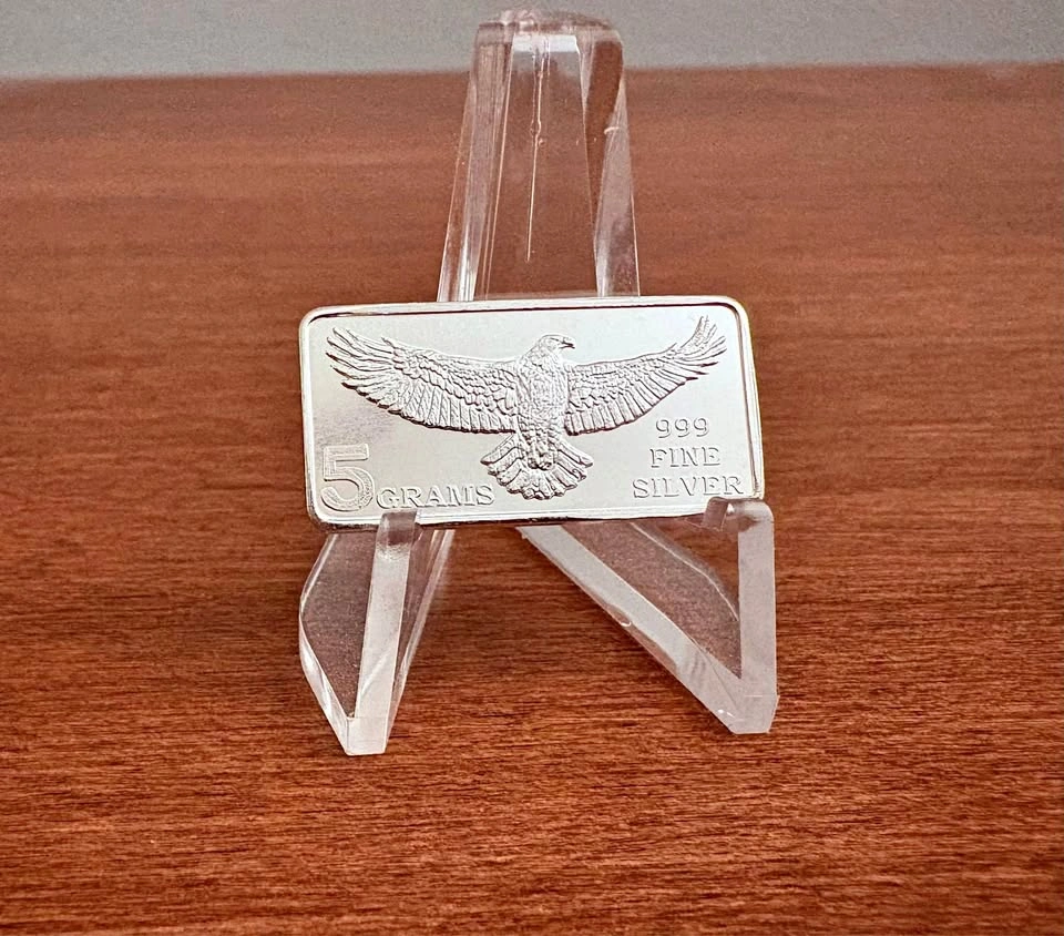 Back in stock with 3 available. 5 gram .999 fine/pure silver eagle bullion bar. Nice little piece of fractional pure silver which has many benefits: - Great way to start silver stacking, start small! - Holds intrinsic value - Can't be frozen and/or tracked like cash in a bank account - Easily convertible to cash when needed or in an emergency - Small denomination gives greater flexibility during sale or barter - Metal value appreciation and sales on .999 fine silver are tax free - Interesting bit of nostalgia as the govt removed silver from our regular Canadian currency coins in 1968 Can meet at public place in Maple Ridge. Include stand - add $3 Stand is too thick to be purchased in person. Check out my other listings for more unique bullion items & gift ideas. Thanks! Price can be subject to change with significant market fluctuations in silver spot price