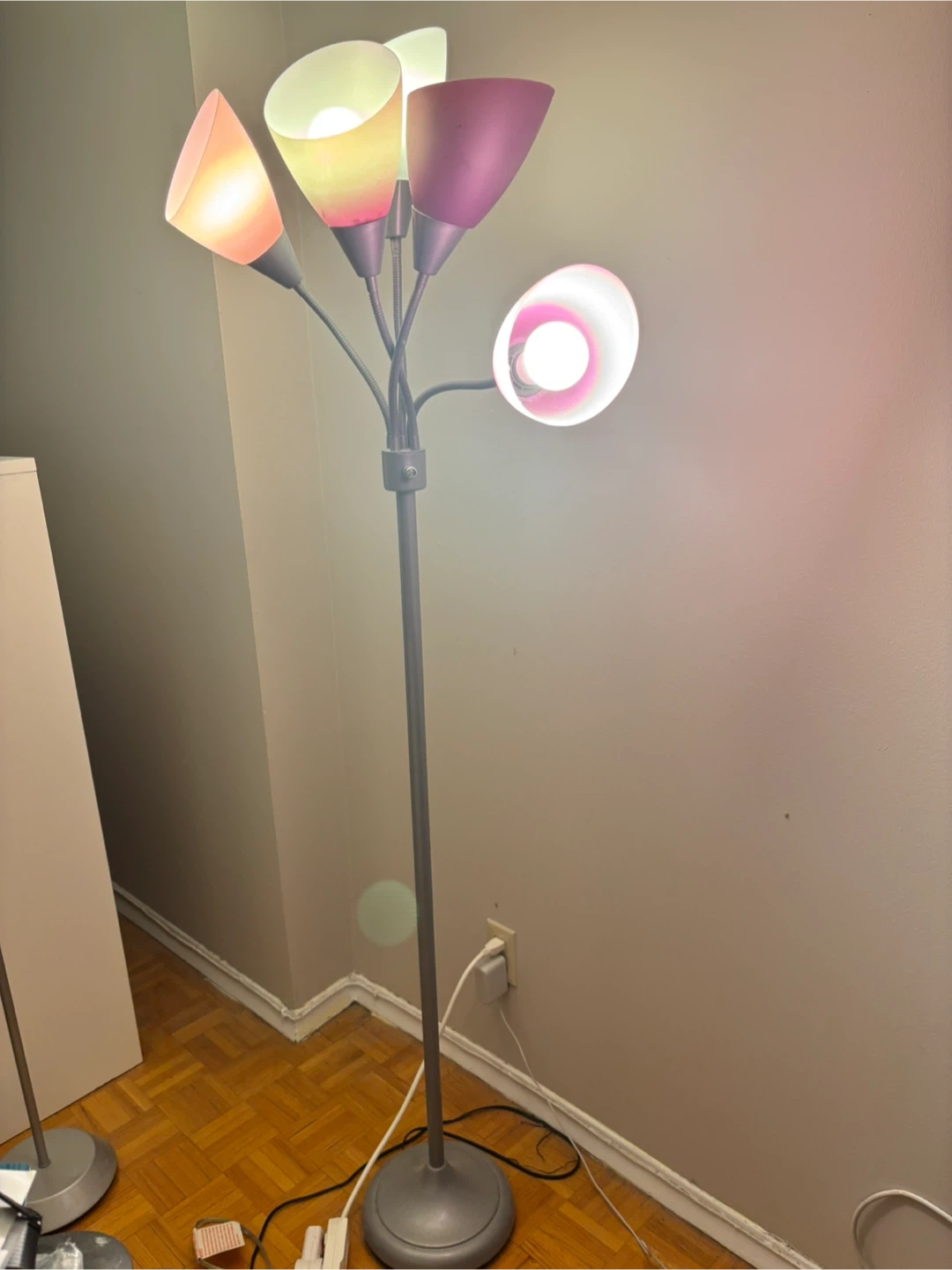 Add a pop of colour to your space with this unique 5-light floor lamp! Each light has a different coloured shade of pink, creating a fun and vibrant atmosphere. The lights are adjustable and you can turn on a couple of lights or all of them.