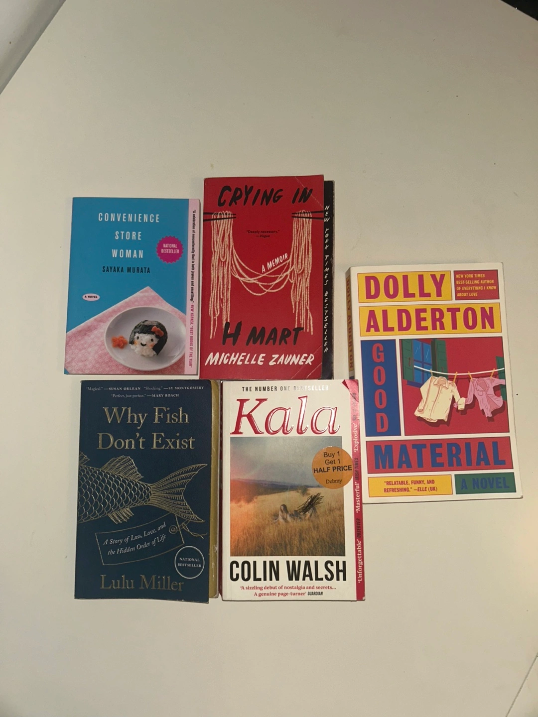 $5 per book or discount for purchasing multiple! All paperback books. - Convenience Store Woman by Sayaka Murata - Crying in H Mart by Michelle Zauner - Why Fish Don't Exist by Lulu Miller - Kala by Colin Walsh - Good Material by Dolly Alderton Pick up in Kitsilano/Broadway, or can arrange to meet near Main Street-Science World station.
