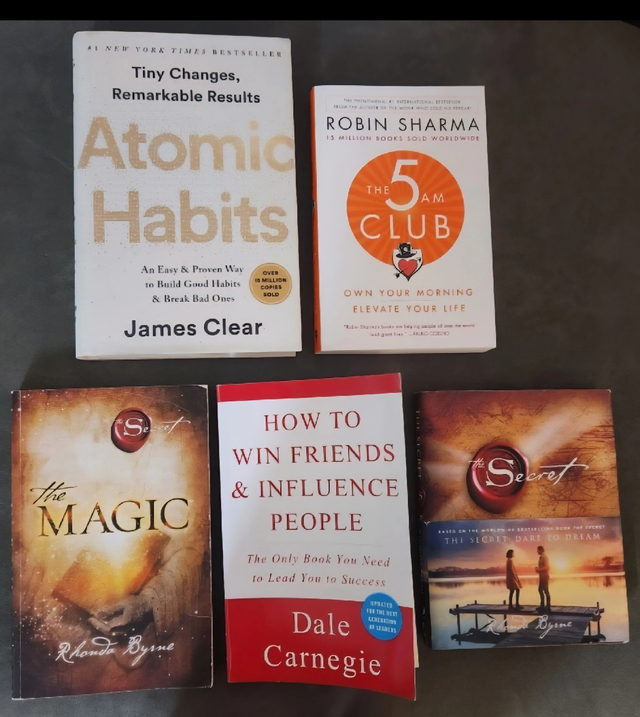 Selling a collection of five popular self-help books! Includes: - Atomic Habits by James Clear - The 5 AM Club by Robin Sharma - The Magic by Rhonda Byrne - How to Win Friends & Influence People by Dale Carnegie - The Secret: Dare to Dream by Rhonda Byrne $15 each.