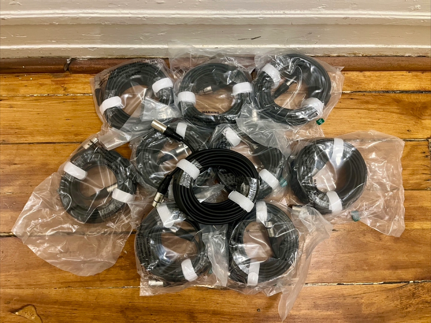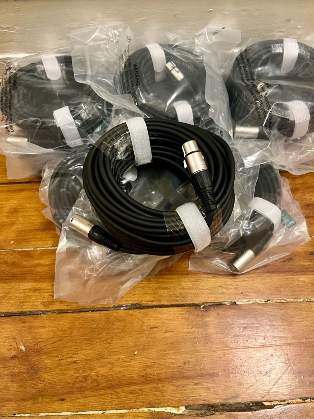 I bought too many microphone cables when I set up my drum recording rig so I have these brand new cables for sale. 50 foot long XLR cables, includes two velcro cable wraps each. I have 12 available, $25 each or $275 if you take all 12 at once. Located near Liberty Village for pickup and can possibly deliver.